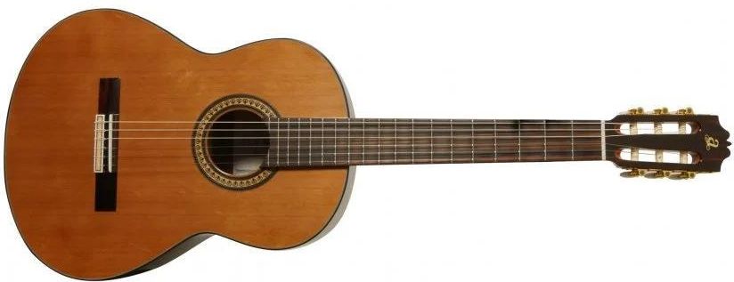 Admira A4 - gitara klasyczna 4/4 top: lity cedr boki i tył: heban binding: palisander gryf: mahoniowy z wzmocnieniem Kabukalli podstrunnica: Kabukalli mostek: Kabukalli (2 białe linie) klucze: złote, lyre struny: Savarez