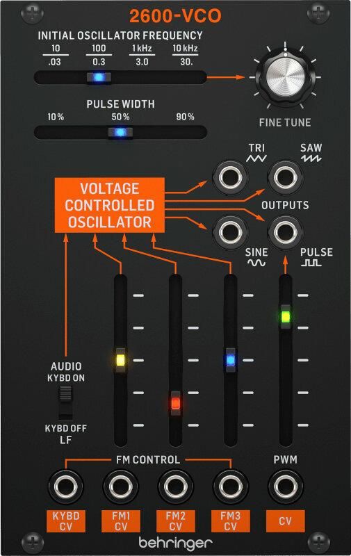 Behringer 2600-VCO – legendarny moduł VCO w formacie eurorack Główne cechy Niesamowite brzmienie modułu VCO z lat 70. Autentyczne odtworzenie oryginalnej konstrukcji ARP 2600 VCO oferuje cztery jednoczesne ustawienia przebiegu fali: sine, triangle, saw oraz pulse VCO umożliwia szeroką kontrolę częstotliwości przebiegu fali: od 10 Hz, do 10 kHz, lub 0.03 Hz do 30 Hz w trybie LF Ustawienia PWM (Pulse Width Modulator) mogą być kontrolowane jednocześnie ręcznie oraz poprzez zewnętrzne wejście CV Możliwość przełączania między trybami LF (z odciętą klawiaturą) oraz Audio (klawiatura włączona) Osobne wyjścia na każdy przebieg oraz pięć wejść CV do kontrolowania parametru Pitch oraz PWM Osiem kontrolerów i przełączników oferuje dostęp w czasie rzeczywistym do wszystkich najważniejszych parametrów Wymiary Eurorack: 16 HP, XX mA +12 V, XX mA -12 V 2600-VCO to bogaty w funkcje moduł z czterema jednoczesnymi przebiegami: sinusoidalnym, trójkątnym, piłowym i impulsowym, które pozwalają na zadziwiającą paletę możliwości tonalnych. Możesz nawet kontrolować częstotliwość oscylatorów, która waha się od 10 Hz do 10 kHz i od 0,03 Hz do 30 Hz, gdy 2600-VCO jest przełączone w tryb LF. VCO można również dostroić do innych instrumentów lub VCO za pomocą pokrętła Fine Tune. Dostosuj zakres szerokości impulsu w dowolnym miejscu od 10% do 90%, a będziesz gotowy do rocka, niezależnie od tego, czy jesteś w zespole, czy integrujesz 2600-VCO ze swoją autorską konfiguracją!