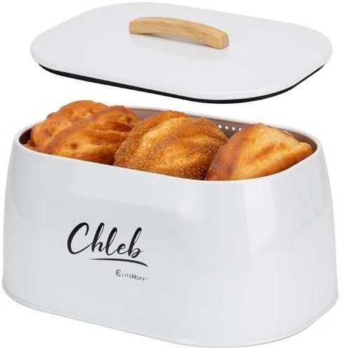 Nowoczesny chlebak marki ELITEHOFF wykonany z wytrzymałego metalu i wyposażony w pokrywę z drewnianym uchwytem, nie tylko pomaga w przechowywaniu pieczywa, ale również stanowi atrakcyjny element wystroju. Najważniejsze cechy: solidna, lekka konstrukcja wykonana z metalu wygodna pokrywka z naturalnym uchwytem z drewna praktyczna pojemność: 34 × 24 × 17 cm chroni pieczywo przed wysychaniem i utratą świeżości łatwe czyszczenie – wystarczy przetrzeć wilgotną ściereczką design, który łączy funkcjonalność z estetyką kolor biały To nie tylko pojemnik na pieczywo, ale także stylowy dodatek, który podkreśli charakter Twojej kuchni. Dzięki przemyślanej konstrukcji chlebak zapewnia dłuższą świeżość wypieków i pomaga zachować porządek na blacie.