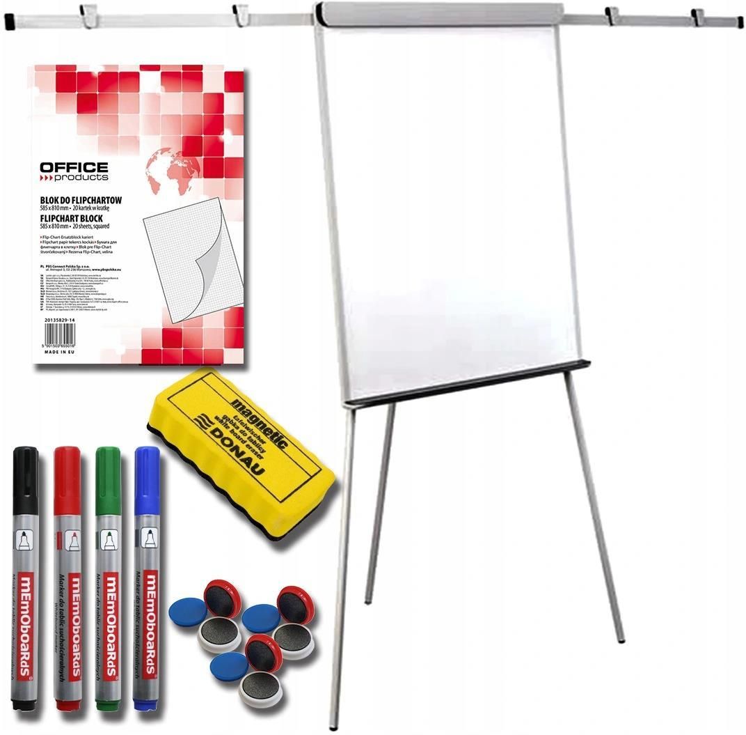 Flipchart tripod suchościeralny magnetyczny 100x70 cm z ramionami symbol TF20 seria Office pro GREY wyprodukowany w Polsce Cena katalogowa 599 zł brutto Nasza promocyjna cena 399,00 zł brutto + zestaw startowy tylko do wyczerpania stanów magazynowych Flipchart to jeden z produktów, bez którego trudno sobie wyobrazić prowadzenie prezentacji. W przypadku tej tablicy, wykładowca może prowadzić zajęcia na 3 arkuszach jednocześnie. Flipchart znajdzie zastosowanie w szkołach, salach konferencyjnych, w biurze jak i w domu. Powierzchnia lakierowana suchościeralna - magnetyczna . Wymiar tablicy 70×100 cm. Regulowana wysokość flipcharta do 186 cm. Podstawa trójnożna. Istnieje możliwość zawieszenia bloku A1 oraz EURO, poprzez odpowiednie ustawienie rozstawu haków. Haki na blok schowane pod unoszony docisk papieru. 2 ramiona boczne rozkładane metodą „klik-klik”. Konstrukcja aluminiowa w kolorze popielatym, z eleganckimi szarymi wykończeniami. Produkt wyposażono w specjalną półkę na akcesoria na całej szerokości. Nowoczesny design oraz dobór kolorów idealnie wkomponuje się w otoczenie. Gwarancja: 10 lat na powierzchnię lakierowaną, 2 lata na produkt. Bloki zawieszane na haczykach Haczyki schowane pod dociskiem Zabezpieczenie przed przypadkowym złożeniem na skutek potrącenia. Ramiona boczne rozkładane metodą „klik-klik” Zaciski na ramionach do przypinania kartek Półka na całej szerokości flipcharta Wraz z tablicą otrzymają Państwo komplet markowego zestawu startowego 4 szt. markerów Memoboards, 9 szt. polskich, bardzo mocnych, powlekanych magnesów, gąbka magnetyczna Donau lub Memoboards ( w zależności od dostępności) Blok do flipchartów w kratkę 20 ark.