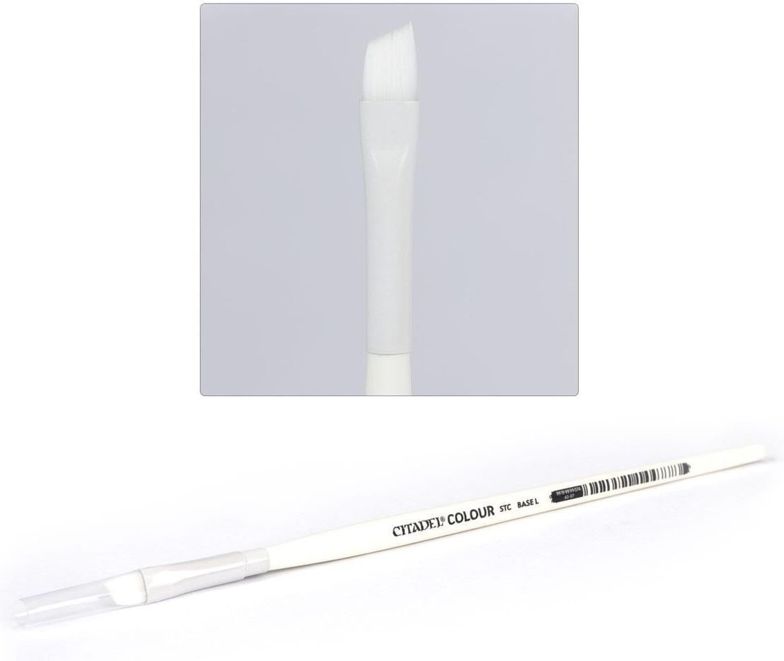 Synthetic Base Brush (LARGE) Jeśli chodzi o malowanie czołgów, rycerzy i pancerników, chcesz uzyskać jak największe pokrycie warstw podstawowych. W tym miejscu pojawia się pędzel Citadel STC L Base, który może zamieść plamę koloru na dowolnej płaskiej powierzchni, która może tego potrzebować. Jako pędzel Citadel STC, włosie zostało wykonane z najlepszych jakie kiedykolwiek wyprodukowała firma Games Workshop w 100% syntetycznych włókien, co pomaga zachować idealny kształt pędzla i zapobiega zwijaniu się końcówki. Ten pędzel został starannie zaprojektowany, aby pomalować najdrobniejsze miniaturowe detale. Jest doskonałym towarzyszem zwykłych pędzli Citadel i został zaprojektowany tak, aby idealnie współpracował z gamą farb Citadel Color.