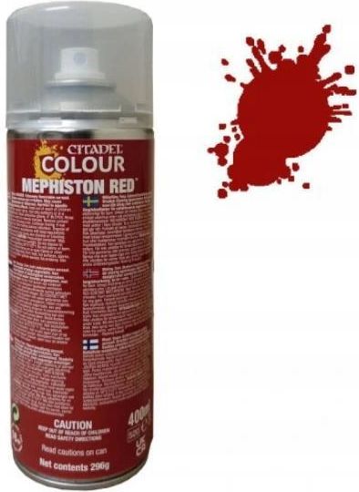Spray w kolorze Mephiston Red od firmy Games Workshop służący idealnie do pokrywania farbą figurek i modeli. Mephiston Red Spray is designed for basecoating all Citadel miniatures. When sprayed over an undercoat, it's a fast way to get a uniform base of colour onto your models. The colour in this spray is exactly the same as Citadel Base, so if any part of the model gets missed when spraying, a quick tidy up with the equivalent paint will provide a complete basecoat. This can contains 400ml of Mephiston Red Spray.