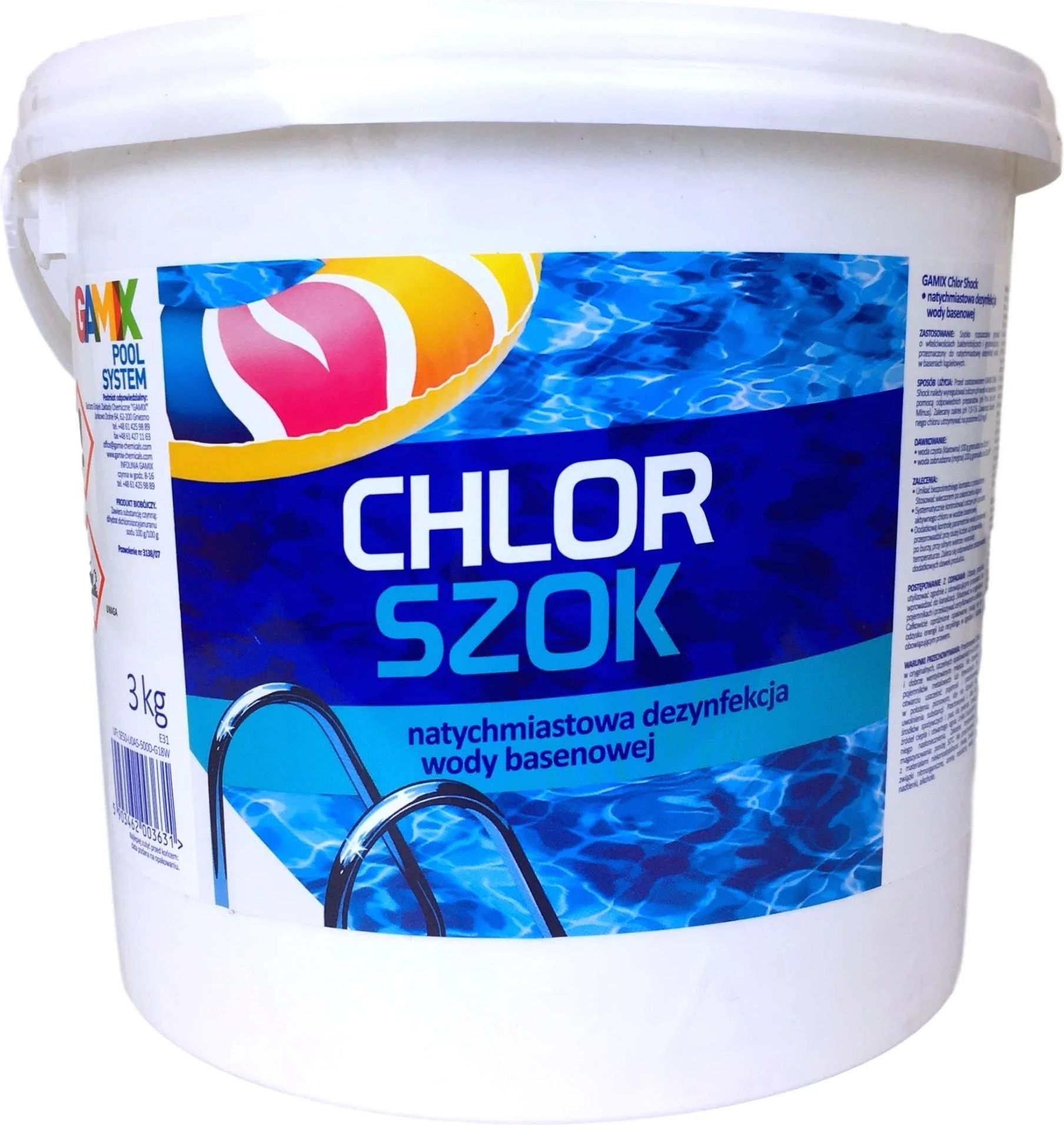 GAMIX CHLOR SZOK 3KG • szybko rozpuszczalny granulat • natychmiastowa dezynfekcja wody basenowej • pozwolenie Ministerstwa Zdrowia na obrót produktem biobójczym nr: 3138/07 ZASTOSOWANIE Szybko rozpuszczalny granulat o właściwościach bakteriobójczych i grzybobójczych, przeznaczony do natychmiastowej dezynfekcji wody w basenach kąpielowych. SPOSÓB UŻYCIA Przed zastosowaniem GAMIX Chlor Szok należy wyregulować odczyn pH wody w basenie za pomocą odpowiednich preparatów (pH Plus lub pH Minus). Zalecany zakres pH 7,0 -7,6. Zawartość aktywnego chloru utrzymywać na poziomie 0,3 mg/l. DAWKOWANIE • woda czysta (klarowna) 100 g granulatu na 10 m3 • woda zabrudzona (mętna) 200 g granulatu na 10 m3 ZALECENIA - Rozpuść odpowiednią ilość preparatu w wiadrze z wodą basenową, przy włączonej filtracji wlać bezpośrednio do basenu zachowując odpowiednie środki ostrożności - Unikać bezpośredniego kontaktu z produktem