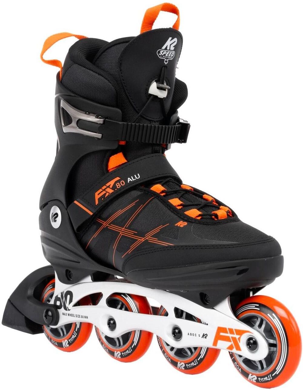 Rolki męskie - Średnica kółek 80 mm, Twardość kółek 80A, Liczba kółek 4, Klasa łożysk ABEC 5, Kolor Czarny Czerwony, Hamulec Tak, System mocowania sznurówki z szybkim wypięciem + rzep + klamra, Rama Aluminium