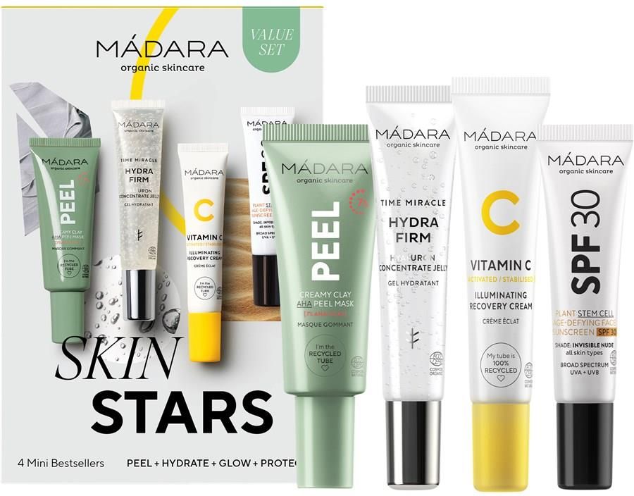 Zestaw Madara Skin Stars 4 Mini Bestseller Set – odkryj cztery gwiazdy pielęgnacji Madara w jednym zestawie! Miniaturowe wersje bestsellerów pozwolą Ci kompleksowo zadbać o skórę – od złuszczania, przez nawilżenie, aż po ochronę przeciwsłoneczną i rozświetlenie. To idealny wybór dla tych, którzy rozpoczynają przygodę z naturalną pielęgnacją lub szukają kompaktowego zestawu na podróż. Formuły oparte na naturalnych składnikach aktywnych zadbają o świeży, promienny wygląd Twojej skóry w każdej sytuacji. Każdy kosmetyk w zestawie jest wegański, naturalny i posiada certyfikat ECOCERT/COSMOS Organic. W skład zestawu wchodzą: Madara Peel Brightening 5% AHA Peel Mask, maseczka peelingująca, 17 ml Madara The Miracle, Hyaluron Concentrate Jelly, nawilżające serum-koncentrat, travel size, 15 ml Madara Vitamin C, nawilżający krem z witaminą C, 15 ml Madara Plant Steam Cell Age-Defying Face Sunscreen, krem do twarzy przeciwzmarszczkowy SPF30, 40 ml