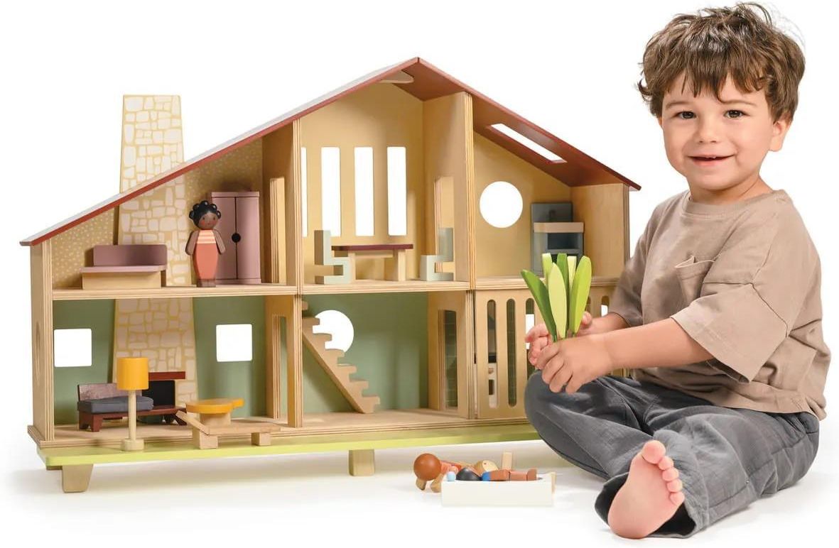 Domek dla Lalek Cedar Chalet, Mentari Wyjątkowy domek dla lalek inspirowany stylem modernistycznym połowy XX wieku. Czyste linie, otwarte przestrzenie i bliskość natury - tak można opisać Cedar Chalet! Ten retro domek wygląda jak prawdziwy dom, a jego kuchnia przypomina tę, którą można znaleźć w domu rodziców czy dziadków! Charakterystycznym elementem domku jest komin z kamieniami - w stylu pebble dash, który biegnie od podstawy aż po dach. Na parterze znajduje się przesuwana krata, która prowadzi na mały, miejski trawnik – idealny dla lalek do relaksu na powietrzu. W zestawie jest pełne wyposażanie - meble do kuchni, salonu, sypialni, jadalni i łazienki. Cedar Chalet to pierwszy taki domek w naszej ofercie! Otwarte przestrzenie, prostota - to wszystko sprawia, że każdy domownik będzie dobrze się w nim czuć - laleczki, zwierzątka, każdy, kto lubi harmonię z naturą. ~~~ Mentari to siostrzana marka naszej wyjątkowej marki Tender Leaf Toys. Produkty Mentari to pomysłowe zabawki przedstawione w prostej formie. Zaprojektowane tak, żeby zaspokoić potrzeby najmłodszych. Produkowane są z drzewa kauczukowego z Indonezji. Drewno kauczukowe cechuje się wyjątkową wytrzymałością, jest przyjemne w dotyku i ma charakterystyczną strukturę. Do pomalowania zabawek Mentari zostały użyte bezpieczne farby. Odmienna kolorystyka sprawia, że siostrzana marka Tender Leaf ma swój niepowtarzalny styl i charakter. ~~~ Zestaw zawiera Kuchenka i lodówka do kuchni, stół jadalniany z 2 krzesłami, wanna i toaletka do łazienki, podwójne łóżko i szafa do sypialni, sofa w stylu lat 50., mała roślina doniczkowa, lampa i stolik kawowy do salonu. Produkt przeznaczony dla dzieci w wieku powyżej 3 roku życia. *************** Wymiary zabawki: 75cm x 27 cm x 49 cm(wys.) Wymiary opakowania