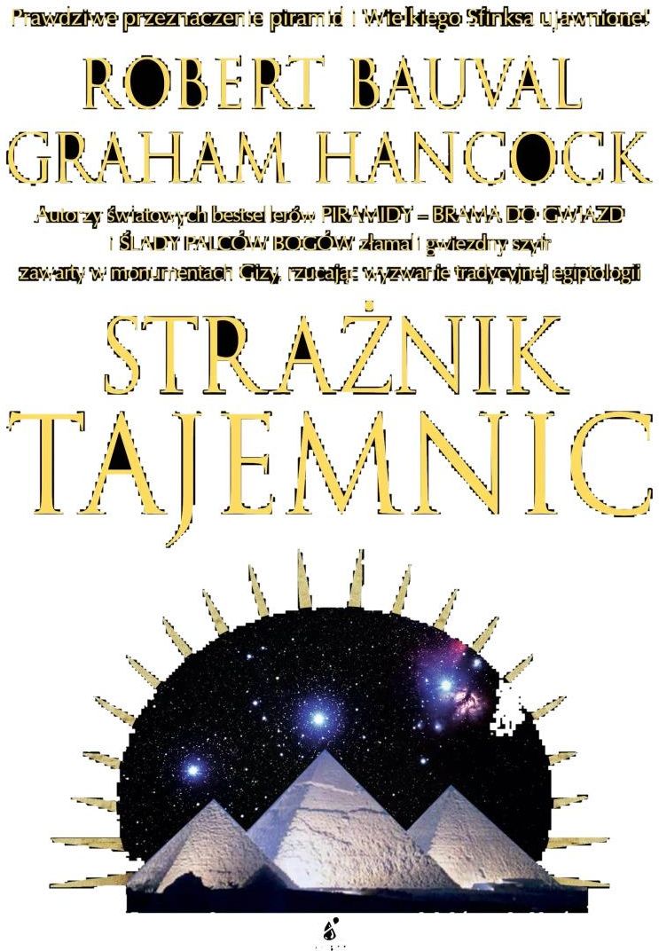 PRAWDZIWE PRZEZNACZENIE PIRAMID I WIELKIEGO SFINKSA UJAWNIONE! AUTORZY ŚWIATOWYCH BESTSELLERÓW „PIRAMIDY – BRAMA DO GWIAZD” I„ŚLADY PALCÓW BOGÓW” ZŁAMALI GWIEZDNY SZYFR ZAWARTY W MONUMENTACH GIZY, RZUCAJĄC WYZWANIE TRADYCYJNEJ EGIPTOLOGII! Od tysięcy lat Wielki Sfinks spogląda na wschód. Zapatrzony wwieczność, odczytuje zgwiazd przesłanie, októrym ludzkość zapomniała. Przesłanie, które domaga się, by je nareszcie zrozumiano… ROBERT BAUVAL, legenda niezależnej egiptologii, orazGRAHAM HANCOCK, jeden znajwybitniejszych inajbardziej kontrowersyjnych badaczy prehistorii, autor bestsellerów przetłumaczonych na 27 języków, na podstawie badań archeoastronomicznych dowodzą, że Sfinks jest otysiące lat starszy, niż twierdzi współczesna nauka. Powstał nie2500 lat p.n.e., lecz 8000 lat wcześniej! – wpoczątkach astronomicznej ery Lwa. A piramidy są dokładną gwiezdną mapą Pasa Oriona sprzed 12500 lat, zamkniętą w15000000 ton kamiennych bloków iniosącą przesłanie ich budowniczych. Wmistrzowskim naukowym detektywistycznym śledztwie Bauval iHancock używali komputerowych symulacji, by złamać starożytny gwiezdny szyfr, zawarty wmonumentach Gizy, ina nowo zinterpretować Teksty Piramid iinne egipskie zapisy. I ujawnili prawdziwe przeznaczenie piramid, wzniesionych przezprzedstawicieli prehistorycznej wysokorozwiniętej kultury, którzy zakodowali wnich swoją wiedzę. To odkrycie otwiera drzwi do zaginionego rozdziału naszej historii inieznanych początków cywilizacji… Graham Hancock w„Śladach palców bogów”, światowym bestsellerze sprzedanym w10 milionach egzemplarzyi nazwanym przez„The Times” „jednym zprzełomowych wydarzeń intelektualnych naszych czasów”, przedstawia sensacyjne dowody istnienia zaginionej prehistorycznej cywilizacji, która dała początek wszystkim starożytnym kulturom. W„Magach bogów”Hancock barwnie prezentuje dalsze sensacyjne dowody zkolejnych dwudziestu lat naukowego śledztwa. Udowadnia, że globalny kataklizm nastąpił 12 000 lat temu. Ocaleli zniego nieliczni, nazywani wstarożytnych tekstach magami bogów. W„Zwierciadle nieba”Hancock idzie dalej, odkrywając najlepiej strzeżony sekret naszej przeszłości – pradawną duchową wiedzę, która wywarła wpływ na kultury Sumeru, Egiptu, Indii iGrecji. W „Zatopionych królestwach epoki lodowcowej” Hancock rzucił kolejne wyzwanie tradycyjnej nauce. Badając wraz zzespołem płetwonurków przybrzeżne wody Egiptu, Indii, Chin, Tajwanu iJaponii, szukał prawdy opotopie, ukrytej wmitach sprzed tysięcy lat. Dzięki nim znalazł podwodne ruiny prehistorycznych budowli. Były tam, gdzie wskazywały opowieści starożytnych, choć archeolodzy twierdzą,że są dziełem natury.