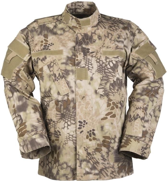 Bluza ACU (Army Combat Uniform) wykonana w podstawowym kroju bluzy używanym przez amerykańską armię. Opis przedmiotu: - tkanina: 100% bawełna Ripstop - kolor: Kryptek Nomad - 2 skośne kieszenie piersiowe na rzep - 2 kieszenie na ramionach na rzep - 3 rzepy na plakietki identyfikacjne - wysoki kołnierz ze stójką na rzep - główne zapięcie na zamek błyskawiczny zabezpieczony patką na rzep - zakładki z dodatkowej warstwy materiały na plecach dla lepszego komfortu użytkowania - mankiety zapinane na rzep