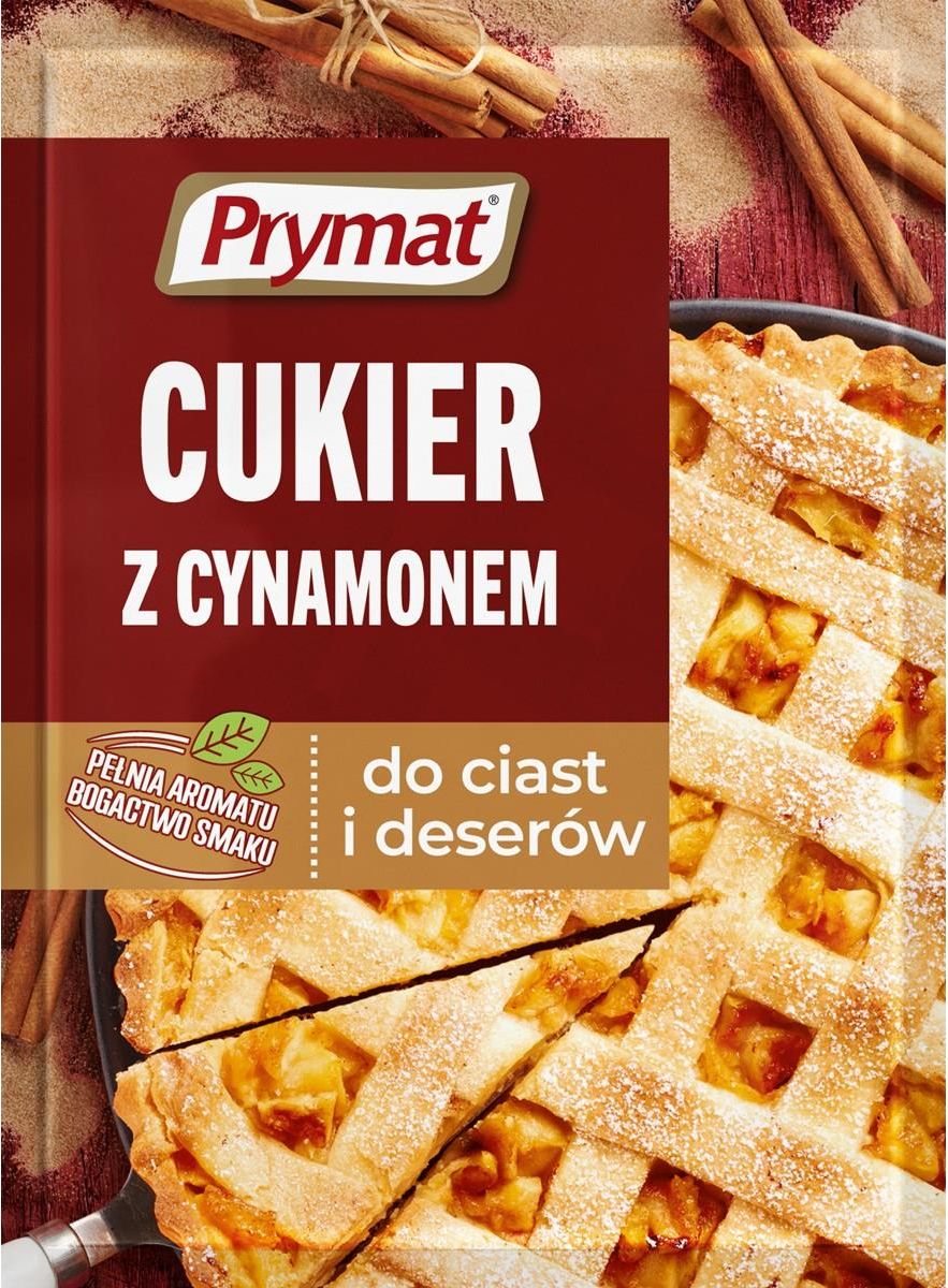 Podkreśl smak swoich wypieków niezwykłymi przyprawami. Cukier z cynamonem Prymat, nie tylko nada wypiekom wyjątkowego smaku, ale także aromat. Mieszanka od Prymat, świetnie sprawdzi się do wypieków z owocami, a także wielu dań na słodko jak naleśników, gofrów, wafli, ryżu na mleko. Warto dodać go również do deserów, kompotów czy słodkich sałatek. Jeśli lubicie kawę z dodatkiem cynamonu, możecie tą mieszankę także do tego wykorzystać. Szarlotka i wszelkiego rodzaju przetwory z jabłek świetnie komponują się z cynamonowym aromatem. Już kilka szczypt mieszanki nada deserom z jabłek ciekawego, korzennego smaku. Sprawdź również inne słodkie mieszanki Prymat: Cukier z prawdziwą wanilią do ciast i deserów Prymat Cukier ze skórką cytryny do ciast i deserów Prymat