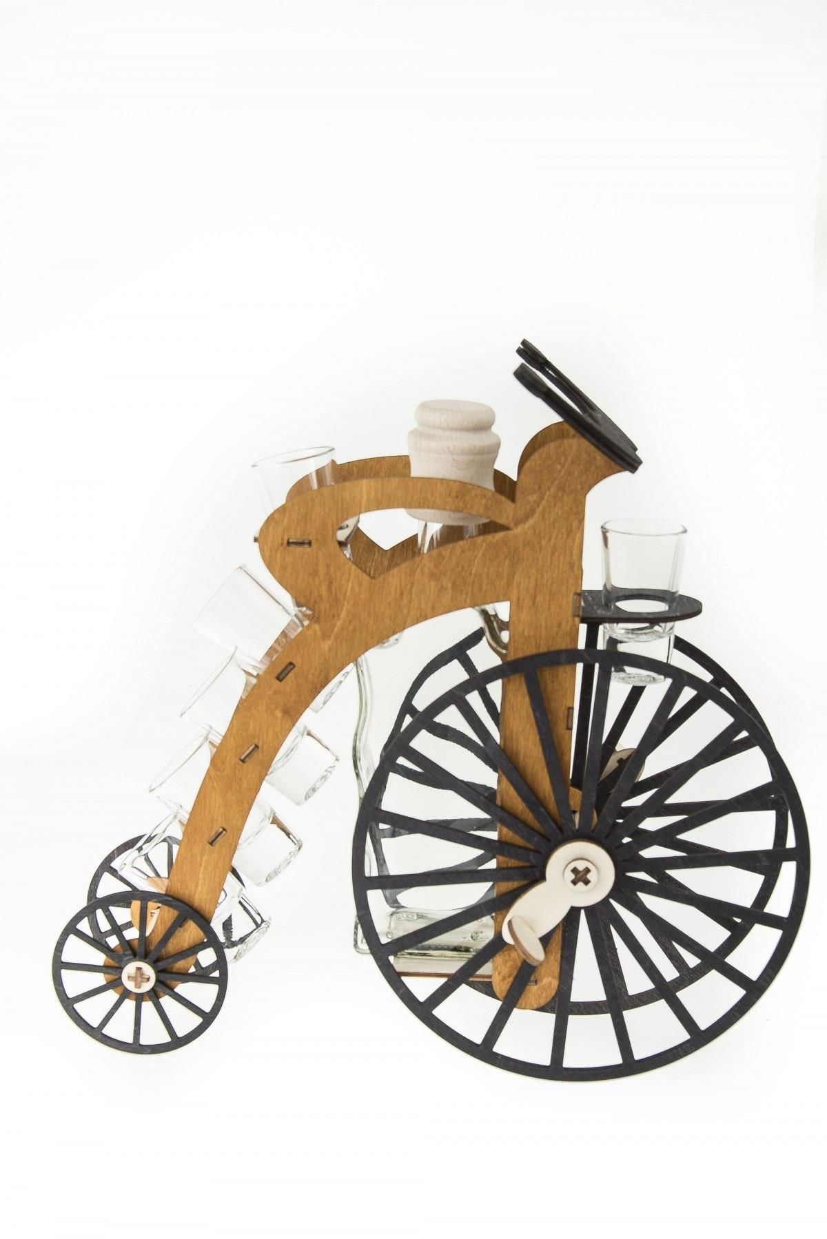 Zestaw ROWER KOLARSKI Producent: Anapol Wykonanie: szkło, drewno Zestaw zawiera drewniana podstawa wycinana laserowo z płyty HDF o wymiarach o wymiarach 30 cm x 10 cm x 19 cm x 1 szt szklana karafka z korkiem o pojemności 0,5 l x 1 szt kieliszki do wódki pojemność 25/30 ml x 6 szt Napis: "TOUR THE …