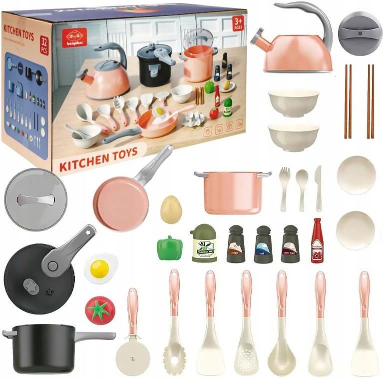 GARNKI DLA DZIECI ZESTAW KUCHENNY NACZYNIA XXL RYŻOWAR MISECZKI TALERZE RÓŻ REWELACYJNY, DUŻY ZESTAW KUCHENNY DO ZABAWY! Przenośny zestaw dla małego kucharza, pozwoli dziecku wczuć się w rolę prawdziwego szefa kuchni! Dbałość wykonania oraz realistyczny wygląd gwarantuje pełną satysfakcje i super zabawę! Propozycja dla dzieci które uwielbiają bawić się w dom i z chęcią przyrządzą potrawy dla wszystkich domowników. Dzięki różnorodnym funkcjom Twój maluch może poznawać tajniki gotowania, a także w bezpieczny sposób bawić się przez wiele godzin. Zabawa w małego kucharza to nie tylko przyjemność, ale także sposób na wszechstronny rozwój dziecka, który obejmuje doskonalenie umiejętności manualnych, stymulowanie kreatywności oraz budowanie poczucia samodzielności. Garnki dostępne w trzech kolorach różowy niebieski zielony W wiadomości dla Sprzedającego podaj wybrany kolor. W przypadku braku informacji spakujemy różowy. Najważniejsze cechy Nauka poprzez zabawę Wysoka jakość wykonania Duża ilość elementów w zestawie Piękne, pastelowe kolory Wszystkie niezbędne w kuchni akcesoria, w jedynym miejscu Zestaw Małego Kucharza - wszystko, czego potrzebuje mały szef kuchni! W zestawie garnki, ryżowar, talerze, miski, warzywa, łyżki i wiele innych akcesoriów do zabawy w gotowanie. Prezentowana zabawka pozytywnie wpływa na rozwój wyobraźni dziecka i pobudza jego kreatywność. Maluch uczy się podstawowych czynności związanych z przygotowaniem posiłków, a także czynności porządkowych. Elementy wykonane są z wysokiej jakości tworzywa sztucznego. Mają zaokrąglone, wygładzone krawędzie dzięki czemu są w pełni bezpieczne, także dla małych dzieci. Śliczny zestaw kolorowych garnków zachwyci każdego małego kucharza. Zabawka zapakowana w oryginalne, kolorowe pudełko. Idealnie nadaje się na prezent! Specyfikacja Wiek: 3+ Materiał: Tworzywo sztuczne Wymiary opakowania ok. 27,5 cm x 14,5 cm x 17 cm (dł. x szer. x wys.) Zestaw zawiera garnek z uszami (15cm szer. x 8cm wys.) patelnia (21cm dł. x 11,5 cm) pokrywka uniwersalna (11,5cm x 2 cm), czajnik z pokrywką (12,5cm szer. x 13cm wys) ryżowar (21cm dł. x 11cm wys.) 2x talerz spodek (7cm szer. x 1,5cm wys.) 2x miseczka (8cm szer. x 3,5cm wys.) 2x komplet pałeczek (16cm dł.) sztućce (9,5cm dł): łyżka, widelec, nóż przybory kuchenne (ok 14-16,5cm dł): chochelka, łyżka, cedzak, packa, packa z oczkami, łyżka do makaronu, łyż do pizzy solniczka, pieprzniczka, cukierniczka (6cm wys. x 3cm szer.) keczup (8cm wys. x 2,5cm szer.), butelka oliwy (6cm wys. x 4cm szer.) produkty spożywcze: jajko sadzone (6x6,5cm), jajko w skorupce (4x3cm), papryka (3,5x3,5cm), pomidor (3,5x3cm)