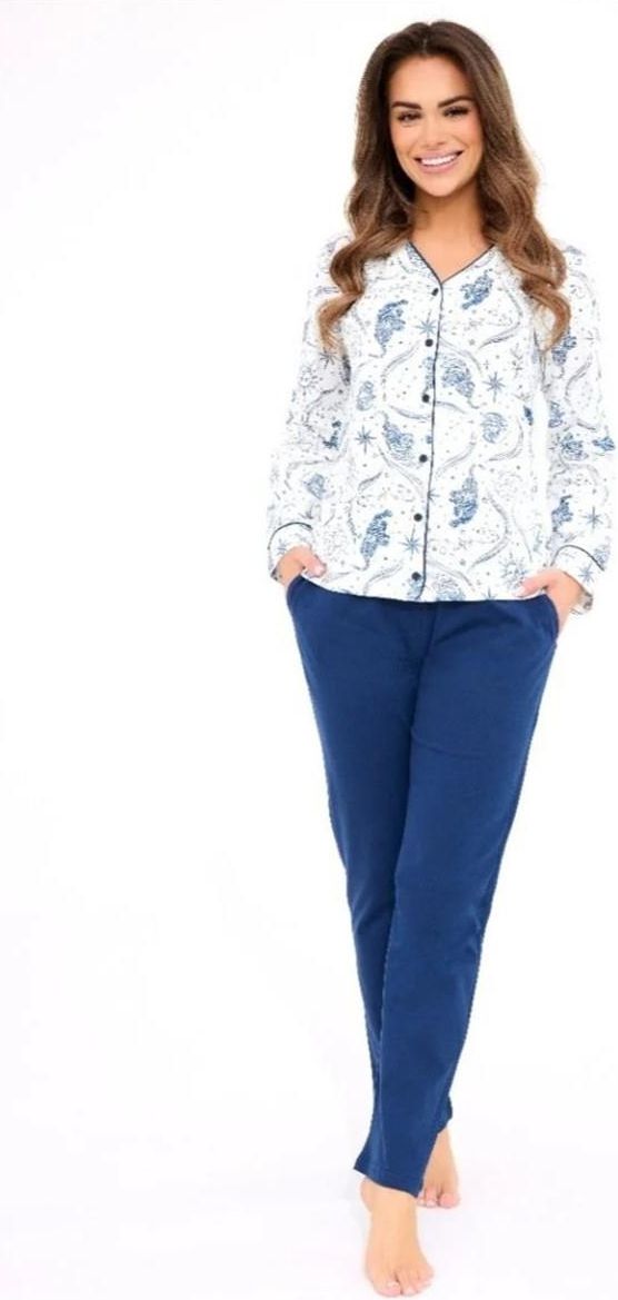 Piżama damska KRISTIN – klasyczna elegancja i pełen komfortPiżama damska KRISTIN DR 682/445 to idealna propozycja dla kobiet ceniących styl, wygodę i funkcjonalność. Wykonana z wysokiej jakości, wzorzystej bawełny, bluzka z długim rękawem jest rozpinana na guziki – praktyczna i elegancka. Komplet uzupełniają jednolite, długie spodnie z prostymi nogawkami oraz kieszeniami, które dodają wygody na co dzień. Całość uszyta z naturalnej tkaniny zapewniającej komfort termiczny, przewiewność i swobodę ruchów. Piżama zapakowana jest w estetyczne pudełko, co czyni ją również świetnym pomysłem na prezent.