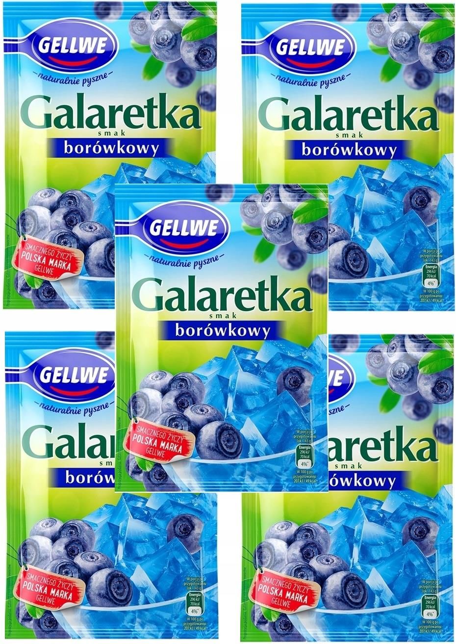 5 X GELLWE GALARETKA SMAK BORÓWKOWY 72 G GELLWE GALARETKA SMAK BORÓWKOWY 72 G cukier, żelatyna, regulator kwasowości (kwas cytrynowy), aromat, barwnik (indygotyna) Może zawierać SOJĘ, MLEKO i zboża zawierające GLUTEN. Wartość odżywcza po przygotowaniu: w 100 g: Wartość energetyczna: 207 kJ/ 49 …
