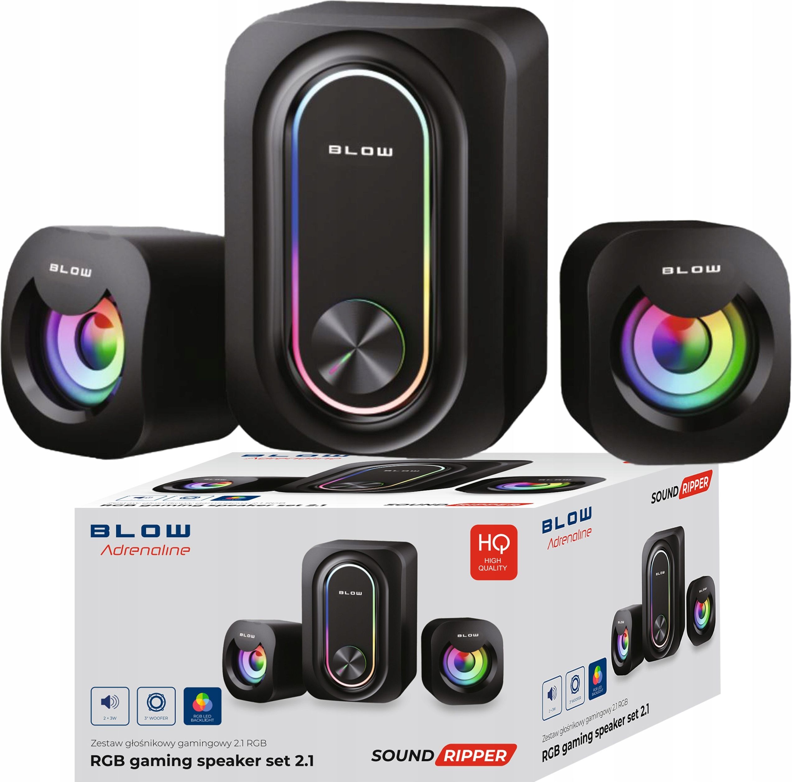 GŁOŚNIKI KOMPUTEROWE GAMING ZESTAW GŁOŚNIKÓW 2.1 RGB LED 2x 3W + WOOFER 5W Małe, eleganckie głośniki do notebooków i komputerów stacjonarnych. Łatwe w przenoszeniu i przechowywaniu, nie zajmują miejsca na biurku. gwarantują czyste i naturalne brzmienie dźwięku. Elegancki wygląd sprawia, że doskonale komponują się z monitorami LCD i innymi akcesoriami. Podświetlenie RGB to dodatkowy atut. Najważniejsze cechy Zestaw z subwooferem Niezastąpione do komputera, laptopa, telewizora i smartfonu Zasilanie z portu USB 5V Stylowe podświetlenie LED Czyste i naturalne brzmienie dźwięku Kompaktowe wymiary Dźwięk dla najbardziej wymagających Zestaw składa się z dwóch głośników które zapewniają czysty dźwięk stereo, oraz jednego głośnika nisko tonowego który jest odpowiedzialny za brzmienie głębokich basów. Przyciągający wygląd Staranne wykonane, wykorzystanie najwyższej jakości materiałów oraz nowoczesny design dało w finale zestaw głośników, który idealnie wygląda na każdym biurku. Efektowne oświetlenie LED nadaje jeszcze większego stylu i z pewnością wpasuje się w przestrzeń każdego pomieszczenia. Uniwersalne zasilanie Głośniki dzięki zasilaniu z gniazda USB mogą zostać wykorzystane w dowolnym miejscu. Do ich działania wystarczy urządzenie wyposażone w wyjście USB np. powerbank, telewizor, komputer stacjonarny, laptop. Specyfikacja Zestaw głośnikowy gamingowy 2.1 RGB Zasilanie: DC 5V Moc: 5W woofer + 2x3W Głośniki 1x3"/ 2x2" Podświetlenie RGB Zakres częstotliwości: 60Hz-20KHz Indepedancja: 4 Ohm Przewód USB oraz miniJack o długości 90cm Zestaw zawiera 2x głośnik wysokotonowe 1x głośnik niskotonowy instrukcja użytkowania w języku polskim Certyfikat CE Produkty marki BLOW posiadają certyfikat CE który potwierdza spełnienie w pełni rygorystycznych norm Unii Europejskiej dotyczących między innymi bezpieczeństwa zdrowia i ochrony środowiska.