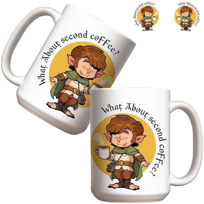 Kto powiedział, że jedna kawa wystarczy? Niziołki wiedzą swoje, po pierwszej porze śniadaniowej zawsze przychodzi czas na drugi. Kubek idealny dla wszystkich, którzy czują w sobie ducha przygody, ale wolą rozpocząć ją po drugiej kawie. Pojemność: 440ml Wysokość: 120 mm Średnica: 85 mm Materiał: ceramika