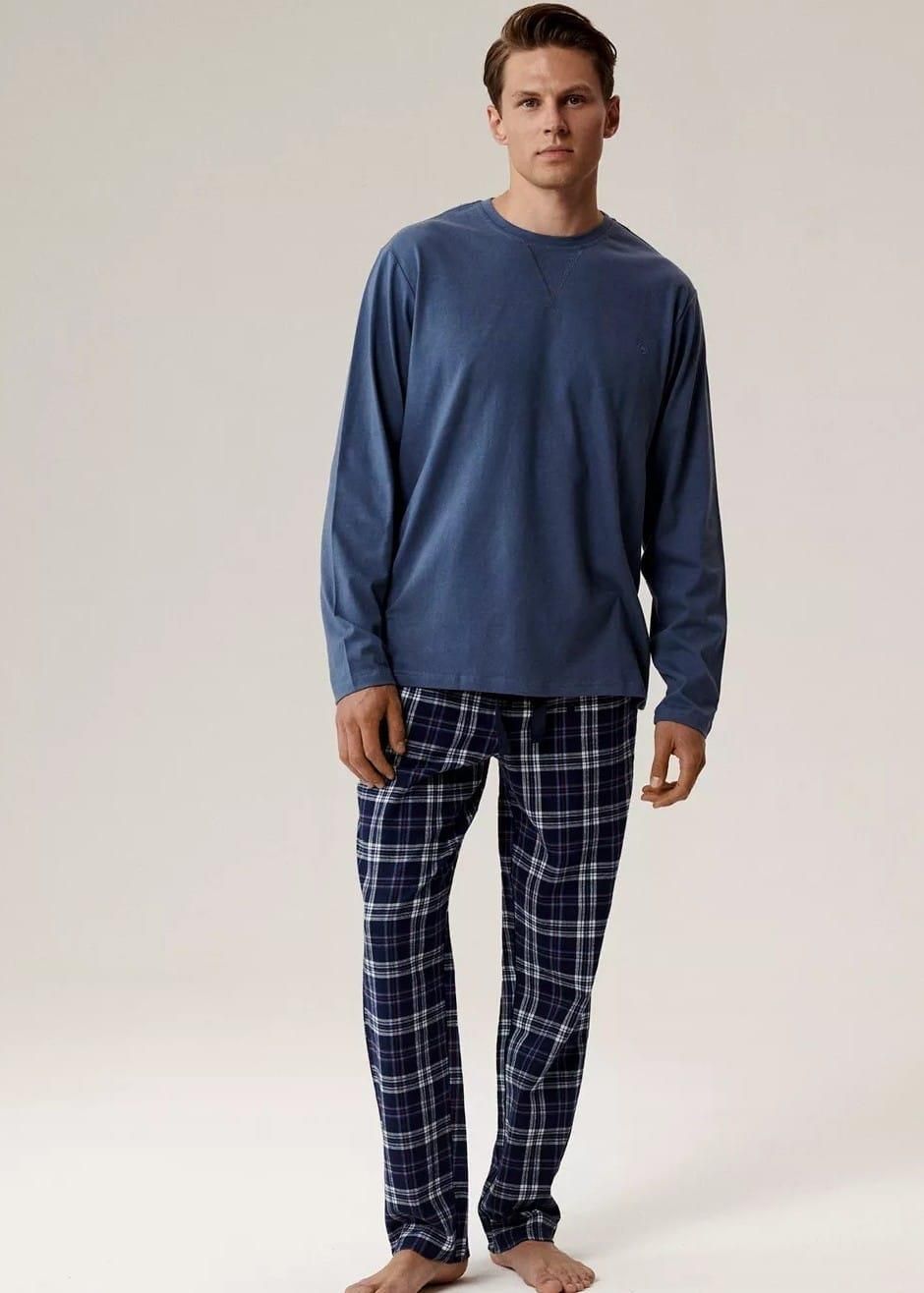 Piżama męska koszulka z długim rękawem miękka i przytulna w dotyku dzianina, z wyjątkowym „efektem peach efect" (efekt skórki brzoskwini) okrągły dekolt klasyczne spodnie z ciepłej flaneli print w kratkę w pasie sznurek do regulacji obwodu boczne kieszenie Skład: 100% bawełna
