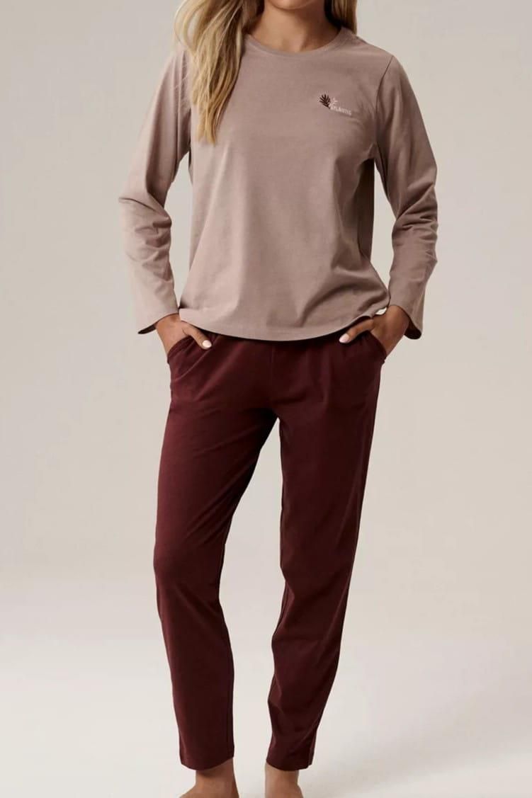 Piżama damska długi rękaw Atlantic NLP-498 ciemnobeżowo-bordowa