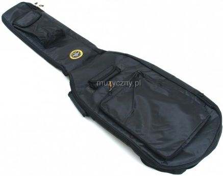 Solidny pokrowiec do gitary basowej z serii Student. Wykonany z grubego, odpornego na uszkodzenia i wodoodpornego materiału RokTex®. Dzięki uniwersalnym wymiarom pasuje do niemal każdej elektrycznej gitary basowej o standardowym kształcie. Wyposażony w 3 uchwyty oraz szelki do noszenia na plecach. Dwie pojemne kieszenie pomieszczą wszelkie niezbędne akcesoria, takie jak kable, efekty czy pasek. Specyfikacja RockBag Student Line Electric Bass Gig Bag : Pokrowiec na gitarę basową Seria: Student Line Pasuje do większości basów elektrycznych Wykonany z wodoodpornego, solidnego materiału RokTex® 10-milimetrowa pianka 7-milimetrowe zamki błyskawiczne Wyłożony czarnym nylonem Wyposażony w autorski system Guitar-Saving-System™ Dodatkowa poduszka chroniąca dolną część instrumentu Łatki ochronne w miejscu kluczy i mostka 2 kieszenie - duża w miejscu korpusu i mała przy gryfie 3 rączki transportowe Szelki do noszenia na plecach Kolor: Czarny Wymiary wewnętrzne: 117 x 33.5 x 6 cm Maksymalna długość korpusu: 58 cm Waga: 1.25 kg