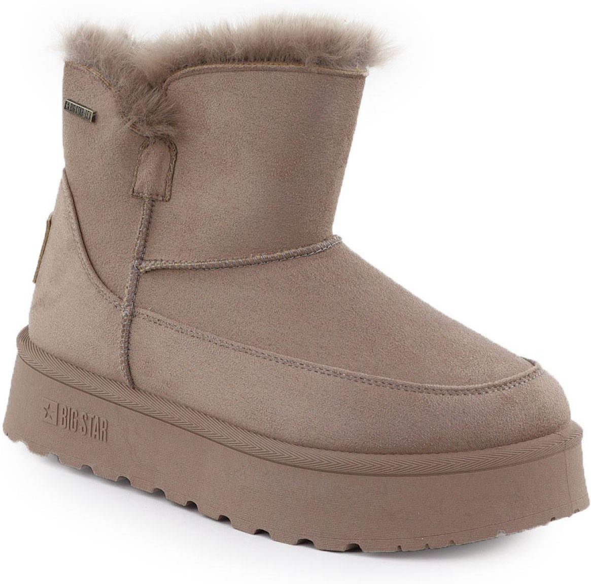 Śniegowce wodoodporne Big Star W Właściwości Modne śniegowce to propozycja od marki Big Star. Buty posiadają grubą podeszwę izolującą od zimna. Wykonane są z wysokojakościowej zamszowej skóry ekologicznej z membraną TEX, która zapewnia wzmożoną odporność na przemakanie. Modny model na platformie idealny juz od pierwszych chłodnych dni