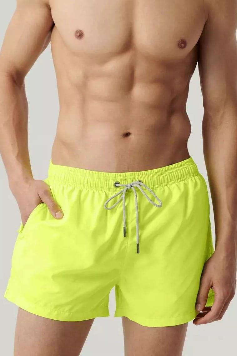 Szorty kąpielowe z krótkimi nogawkami z szybkoschnącego poliestru, który nie odkształca się i nie gniecie. Szorty mają uniwersalnej wysokości stan oraz boczne kieszenie, wiązane na sznurek. Skład:100% poliester.