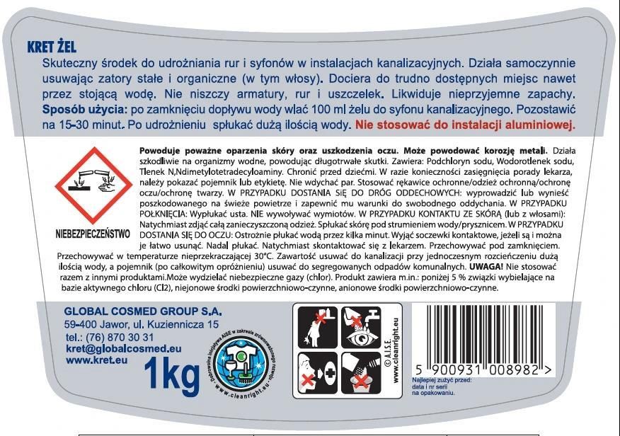 Żel do udrażniania rur Kret 1L to skuteczny środek przeznaczony do chemicznego udrożniania rur i syfonów w instalacjach kanalizacyjnych. Jego zaawansowana formuła pozwala na skuteczne usuwanie zatorów, takich jak tłuszcz, włosy, papier, wata oraz odpadki kuchenne. Żel przenika przez stojącą wodę, docierając do zatorów i rozpuszczając je. Produkt jest bezpieczny dla armatury, rur i uszczelek.