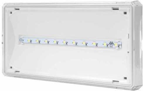 EXIT M CECHY CHARAKTERYSTYCZNE:– Sygnalizacja ładowania akumulatora za pomocą diody LED– Elektroniczne zabezpieczenie przed rozładowaniem baterii– Funkcja automatycznego testowania (opcjonalnie)– Możliwość pracy w trybie awaryjnym lub sieciowo – awaryjnym– Możliwość zastosowania do centralnej baterii– Montaż natynkowy lub podtynkowy do ściany lub sufitu– Korpus oprawy wykonany z poliwęglanu, szyba z plexi– Oprawa może być zasilana ciągle lub nieciągle– Montaż do powierzchni płaskich wewnątrz budynku– Oprawa jest wyposażona w moduł, który pozwala zmieniać tryb pracy na awaryjny DANE TECHNICZNE WYKONANIE: Obudowa z białego poliwęglanu Klosz transparentny z poliwęglanu MONTAŻ:Natynkowy (ściana, sufit) Opcjonalnie podtynkowy (ściana, sufit) - wymaga akcesoriów do montażu podtynkowego Opcjonalnie montaż za pomocą uchwytu sufitowego (sufit) - wymaga akcesoriów do montażu sufitowego NAPIĘCIE ZASILANIA: Oprawa autonomiczna – 220 – 240VAC 50/60Hz Oprawa do centralnej baterii CB – 220 – 240VAC 50/60Hz; 176 – 275VDC ŹRÓDŁO ŚWIATŁA: 1W, 3W LED CZAS ŁADOWANIA: ECO LED: maks. 24h STANDARD: maks. 24h PREMIUM: maks. 12h; energooszczędny układ ładowania CZAS PODTRZYMANIA: ECO LED: 1h lub 3h STANDARD: 1h lub 3h PREMIUM: 1h lub 3h KLASA OCHRONNOŚCI: II STOPIEŃ OCHRONY: IP65 TEMPERATURA OTOCZENIA: Wersja autonomiczna: ta : 0°C ÷ 40°C ta : -25°C ÷ 40°C – opcjonalnie przy zastosowaniu układu grzejnego HTR-25 Wersja CB: ta : -25°C ÷ 50°C OPCJE: SE – awaryjna (na ciemno) SA – sieciowo-awaryjna (na jasno) PT – przycisk testu AT – autotestCB – system centralnej baterii INFORMACJE DODATKOWE: Dioda LED sygnalizująca obecność napięcia i ładowanie akumulatora Zabezpieczenie przed głębokim rozładowaniemWspółczynnik wytrzymałości na uderzenia (IK08) WYMIARY KONFIGURACJA OPRAWY AUTONOMICZNEJ KOD MOC MODUŁ AUTONOMIA [h] TRYB OPCJA KOLOR STRUMIEŃ[lm] AKCESORIA ECO LED ETE 1W E 1 SE X WH 130 - ETE 1W E 1 SE AT WH 130 - ETE 1W E 3 SE X WH 130 PU31 ETE 3W E 1 SE X WH 320 - ETE 3W E 1 SE AT WH 320 - KOD MOC MODUŁ AUTONOMIA [h] TRYB OPCJA KOLOR STRUMIEŃ[lm] AKCESORIA STANDARD ETE 1W C 1 SA X WH 130 - ETE 1W C 3 SA X WH 130 - ETE 3W C 1 SA X WH 320 - ETE 3W C 3 SE X WH 320 - ETE 3W C 3 SA X WH 320 - KOD MOC MODUŁ AUTONOMIA [h] TRYB OPCJA KOLOR STRUMIEŃ[lm] AKCESORIA PREMIUM ETE 1W B 1 SE AT WH 135 - ETE 1W B 1 SA AT WH 135 PU31 ETE 1W B 3 SA AT WH 135 - ETE 3W B 1 SE AT WH 350 - ETE 3W B 1 SA AT WH 350 - ETE 3W B 3 SE AT WH 350 - ETE 3W B 3 SA AT WH 350 - KONFIGURACJA OPRAWY DO CENTRALNEJ BATERII KOD MOC MODUŁ SYSTEM KOLOR STRUMIEŃ [lm] ETE 3W F CB WH 350 LEGENDA ETE – oprawa EXIT M E – układ zasilający dla oprawy w wersji ECO LED C – układ zasilający dla oprawy w wersji STANDARD B – układ zasilający dla oprawy w wersji PREMIUM F – układ zasilający dla oprawy do centralnej bateriiSE – awaryjna (na ciemno) SA – sieciowo-awaryjna (na jasno, możliwość pracy w trybie SE)X – oprawa bez dodatkowych opcji AT – autotestCB – system centralnej bateriiWH – oprawa w kolorze białym