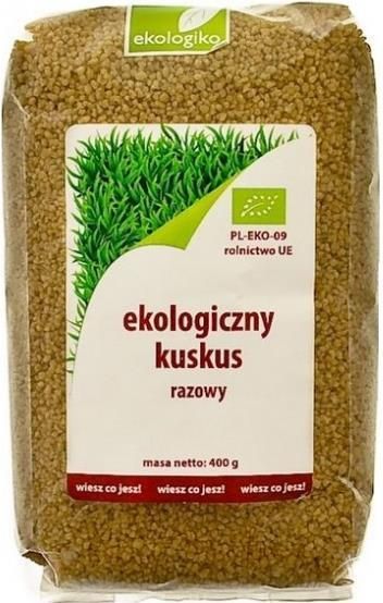 Certyfikat:Pl-EKO-09.Właściwości:Ekologiczny kuskus razowy (pełnoziarnisty) pochodzący ze starannie tworzonych upraw we Włoszech. Wartości odzywcze w 100 g produktu:Wartość energetyczna 1470 kJ/ 347 kcal;Tłuszcz 2,5 g,w tym kwasy tłuszczowe nasycone 0,5 g;Węglowodany 66 g,w tym cukry 1,7 g;Białko 15,0 g;Sód 0,009 g;Błonnik pokarmowy 11,0 g.Składniki:Semolina z pszenicy durum* 100%, * składnik z upraw ekologicznych.Sposób przygotowania:uprzednio wypłukany kuksuk gotować w proporcji 1:1 (1 porcja kaszy na 1 porcję wody). Czas gotowania 5-7 minut. Mozna lekko posolić wodę.Opakowanie: 400 g