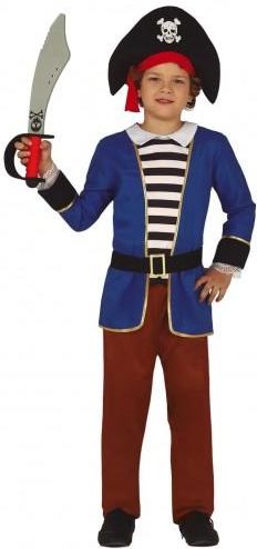 Piracka impreza wiąże się ze zmianą wizerunku. Przemień swoją pociechę w prawdziwego pirata. Kostium dziecięcy Pirata z Wyspy Skarbów zawiera: bluzkę spodnie kapelusz pasek Materiał: tkanina poliestrowa. Bluzka z imitacją niebieskiej marynarki z koszulką w czarno-białe paski. Całość obszyta złotą lamówką.Uroku dodaje czarny pasek zawiązywany z tyłu.Brązowe spodnie z gumką w pasie, dzięki czemu dopasowują się do sylwetki.Kapelusz wykonany z lekko usztywnionego materiału z nadrukiem białej trupiej czaszki. Pirackie przebranie na urodziny bądź karnawał.