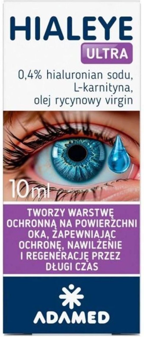Hialeye Ultra jest sterylnym roztworem do oczu. Specjalnie zaprojektowana butelka jest wyposażona w mechanizm uszczelnienia końcówki. Zamyka on końcówkę butelki natychmiast po uwolnieniu kropli, zapobiegając wyciekaniu nadmiaru kropli z butelki. Oznacza to również, że w przeciwieństwie do standardowych kropli do oczu, potencjalnie szkodliwe bakterie nie przedostają się do roztworu, co pozwala zachować jego sterylność przez okres maksymalnie 8 tygodni po pierwszym zastosowaniu. Skład: Hialuronian sodu, L-karnityna, chlorek cynku, wodorofosforan sodu, diwodorofosforan sodu, chlorek sodu, olej rycynowy virgin, Tween 80, woda. Wskazania i działanie: Hialeye Ultra to roztwór do oczu, bez konserwantów, przeznaczony do łagodzenia suchości i podrażnienia oczu o umiarkowanym i ciężkim nasileniu. Tworzy on na powierzchni oka warstwę ochronną, która nawilża, nawadnia i regeneruje warstwę lipidową filmu łzowego, również w nocy. Jest to ustrukturyzowany żel o wysokiej lepkości, który rozprowadza się równomiernie na całej powierzchni gałki ocznej. Działa zatem jak osłona chroniąca oko przed działaniem środowiska zewnętrznego i zmniejsza parowanie łez, zapewniając naturalna ulgę od wysuszenia. Dodatkowa ochrona umożliwia naprawę uszkodzonej warstwy lipidowej występującej w zespole suchego oka. Wyjątkowa formuła Hialeye Ultra zawierająca olej rycynowy regeneruje i uzupełnia wszystkie składniki filmu łzowego, tworząc bardziej stabilną warstwę i zapewniając ochronę powierzchni oka, zwłaszcza przy zamkniętych powiekach. Hialeye Ultra został zaprojektowany tak, aby chronić oko przez dłuższy czas w ciągu dnia i w nocy dzięki składowi, który zawiera wysokie stężenie hialuronianu sodu, lewokarnitynę i olej rycynowy. Aby uzyskać najlepszą długotrwałą ochronę, należy go stosować tuż przed położeniem się spać (można go stosować również w nocy po przebudzeniu się). Hialeye Ultra ma zagęszczoną formułę żelową, która chroni oko przez długi czas, zwłaszcza w nocy, gdy powieki są zamknięte. Wysokie stężenie hialuronianu sodu w połączeniu z olejem rycynowym tworzy stabilną i jednorodną warstwę ochronną oka pod zamkniętymi powiekami również przez całą noc. Przeciwwskazania: W rzadkich przypadkach po podaniu może wystąpić przemijające nieznaczne pogorszenie ostrości widzenia spowodowane lepkością roztworu. Z tego powodu zaleca się odczekać kilka sekund przed podjęciem czynności wymagających wyraźnego widzenia. Odczekać co najmniej 10 minut przed zakropleniem jakiegokolwiek innego leku do oczu. Po pierwszym otwarciu butelki produkt należy zużyć w ciągu 8 tygodni. Przechowywać w miejscu niewidocznym i niedostępnym dla dzieci. Nie połykać. Ze względu na brak szczegółowych danych potwierdzających możliwość stosowania produktu w okresie ciąży lub karmienia piersią oraz możliwość stosowania u dzieci, przed zastosowaniem Hialeye Ultra, należy zasięgnąć porady lekarza lub farmaceuty. Produkt przeznaczony jest wyłącznie do stosowania zewnętrznego do oczu. Przechowywać w temperaturze 2-25 stopni Celsjusza. Zazwyczaj produkt jest przeznaczony do ciągłego stosowania nie dłużej niż przez 30 dni. W przypadku utrzymywania się objawów należy skonsultować się z lekarzem. Produkt zawiera fosforany. U niektórych pacjentów ze znacznym uszkodzeniem rogówki w okresie stosowania roztworów do oczu zawierających fosforany rzadko obserwowano zwapnienie rogówki, dlatego nie należy stosować tego produktu u pacjentów z ciężkim uszkodzeniem powierzchni rogówki (np. widoczna nadżerka, owrzodzenie rogówki). W przypadku noszenia soczewek kontaktowych należy je zdjąć przed zastosowaniem produktu i nie zakładać ponownie przez co najmniej 15 minut. Nie zawiera środków konserwujących. Dawkowanie i sposób stosowania: W razie potrzeby wkroplić 1 lub 2 krople do chorego oka, lekko naciskając na korpus butelki. Jeśli potrzebna jest większa liczba kropli, można bezpiecznie zastosować więcej. Gdy ilość płynu będzie zajmowała mniej niż połowę butelki, w celu podania kropli konieczne będzie nieco mocniejsze naciśnięcie na korpus butelki. Zbyt mocne naciskanie spowoduje stały przepływ płynu zamiast kropli. Producent: Adamed Pharma S.A. Pieńków, Mariana Adamkiewicza 6a 05-152 Czosnów