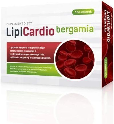 LIPICARDIO Bergamia 30 tabletek ŹRÓDŁO MONAKOLINY K WITAMINA B6 B12 LIPICARDIO Bergamia to wyjątkowy suplement diety, który został stworzony z myślą o wsparciu zdrowia serca oraz optymalizacji metabolizmu energetycznego. Każda kapsułka zawiera starannie dobrane składniki: Kluczowe składniki: Monakolina K (z fermentowanego czerwonego ryżu): Pomaga utrzymać prawidłowy poziom cholesterolu we krwi, wspierając zdrowie serca i układu krążenia. Polifenole: Związki o działaniu antyoksydacyjnym, które pomagają neutralizować wolne rodniki i chronić komórki przed stresem oksydacyjnym. Witamina B6 i B12: Kluczowe dla utrzymania prawidłowego poziomu homocysteiny oraz dla prawidłowego metabolizmu energetycznego. Witamina B6 wspomaga funkcjonowanie układu nerwowego i wspiera metabolizm białek, natomiast witamina B12 odgrywa ważną rolę w produkcji czerwonych krwinek i funkcjonowaniu komórek nerwowych. Stosowanie 1 tabletka dziennie. Działanie utrzymanie prawidłowego poziomu homocysteiny: Dzięki witaminom B6 i B12, które przyczyniają się do regulacji poziomu homocysteiny, co jest ważne dla zdrowia serca, wsparcie metabolizmu energetycznego: Pomaga w przekształcaniu pożywienia w energię, co wpływa na ogólne samopoczucie i witalność, ochrona antyoksydacyjna: Polifenole wspierają naturalne mechanizmy ochrony organizmu przed szkodliwym działaniem wolnych rodników. Wskazania Uzupełnienie diety w składniki aktywne preparatu. Skład Ekstrakt z owoców pomarańczy bergamoty (Citrus bergamia (Risso) Risso & Poit.) standaryzwany na 20% polifenoli; substancja wypełniająca: celuloza mikrokrystaliczna; ekstrakt ze sfermentowanego czerwonego ryżu standaryzowany na 4% monakoliny K; substancja przeciwzbrylająca: sole magnezowe kwasów tłuszczowych; cyjanokobalamina (witamina B12); substancja przeciwzbrylająca: dwutlenek krzemu; chlorowodorek pirydoksyny (witamina B6). Zawartość w 1 tabletce: Ekstrakt z bergamoty - 500 mg w tym polifenole - 100 mg Ekstrakt ze sfermentowanego czerwonego ryżu - 74,5 mg w tym monakolina K - 2,98 mg Witamina B6 - 3 mg (214%) Witamina B6 - 5 µg (200%)
