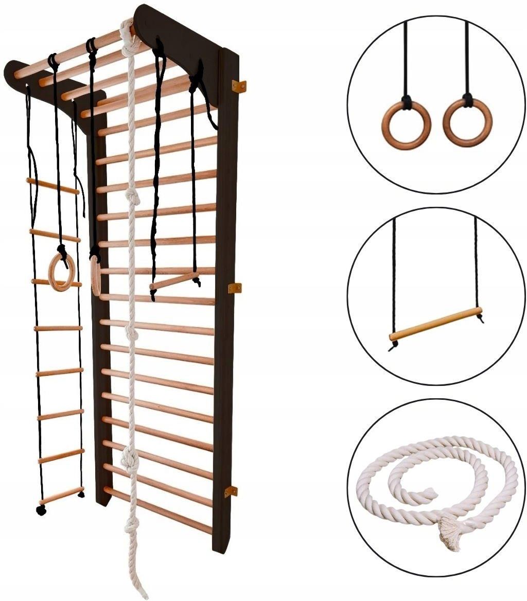Drabinka gimnastyczna Kinder Sport Drewniana drabinka gimnastyczna Kinder Sport to ekologiczne rozwiązanie dla dzieci i dorosłych, uwielbiających uprawiać sport w ciągu całego roku. Każdy słupek drabinki składa się z 2 części. Drabinka do ćwiczeń wspiera rozwój motoryki, koordynacji ta ćwiczy wszystkie partie mięśni. Ona została rozbudowana w kolka gimnastyczne, linę i drabinkę linową. Drabinka do ćwiczeń została wykonana z sosny. Żeby maluch mógł uprawiać sport w wygodnym dla niego czasie i w komfortowych warunkach lepiej przemyśleć dla niego kącik sportowy w zasięgu ręki. ELEMENTY ZESTAWU drewniana drabinka gimnastyczna elementy mocujące drabinkę do ściany drążek do podciągania kółka gimnastyczne ze sklejki 2.5 cm drabinka linowa lina gimnastyczna WAZNE Zestaw przeznaczony dla dzieci od 3 lat i dorosłych Dopuszczalne obciążenie: drabinki i drążka: 100 kg akcesoriów: 60 kg Wysokość zestawu: 230 cm Szerokość zestawu: 80 cm Głębokość drążka: 60 cm Drewno: sosna Montaż: przyścienny Certyfikaty: PN EN 913, PN EN 12346 Zalecenia producenta: dzieci od 3 do 7 lat powinny ćwiczyć tylko pod nadzorem rodziców