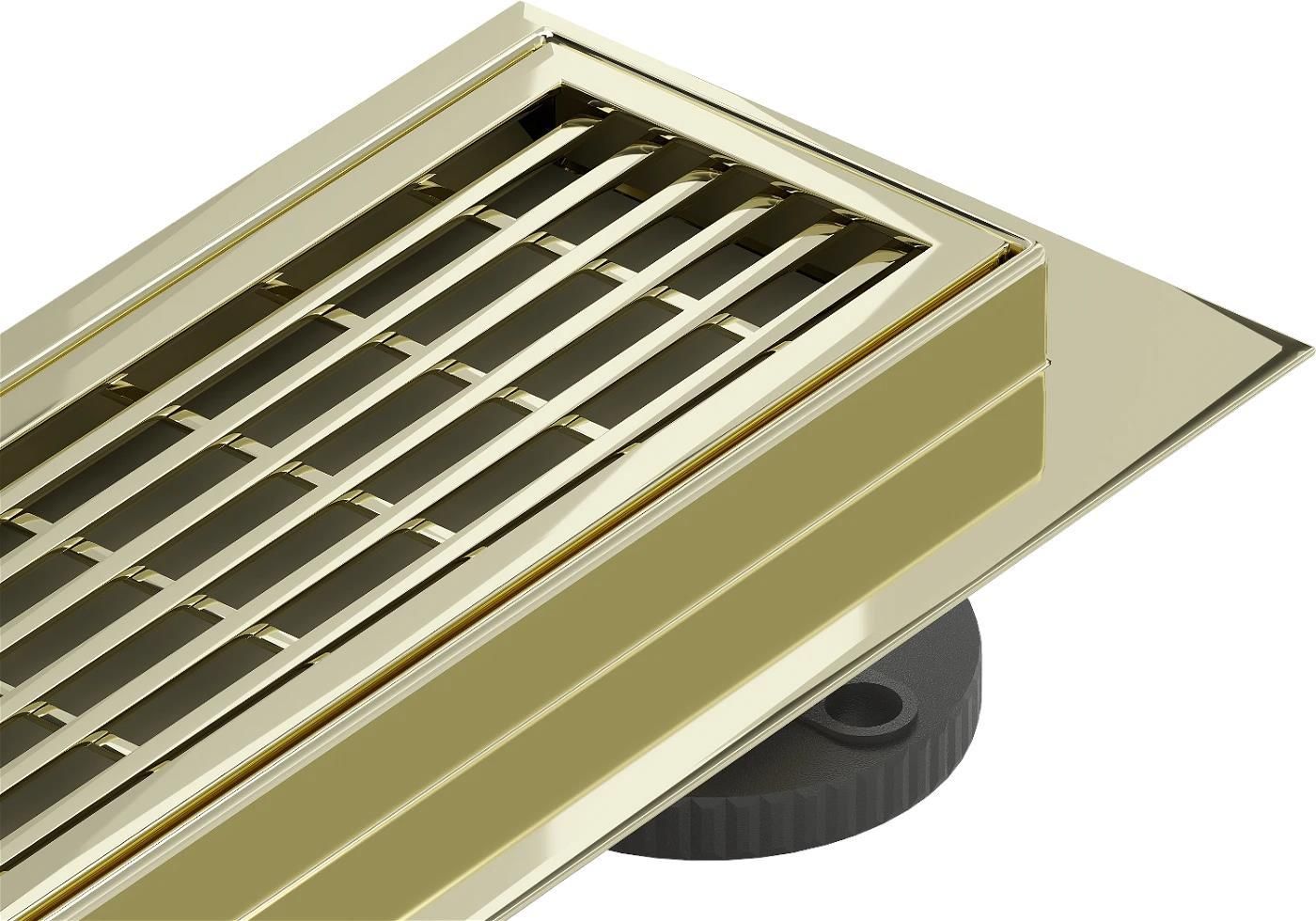 Mexen Flat 360° M33 odpływ liniowy obrotowy 100 cm, złoty Producent: Mexen Seria: Flat 360 Numer katalogowy: 1533100-40 Dane techniczne Materiał: Stal nierdzewna AISI 304 Wykończenie: Złoty Szerokość: 100 cm Głębokość montażu: 52 mm Przepustowość: 50 l/min Kołnierz okalający - 2 cm Głębokość rusztu - 12 mm Rynna i ruszt grubości - 1,2 mm Obrotowy syfon: Tak Możliwość wklejenia płytki: Nie W zestawie Maskownica z dystansami tłumiącymi Wyjmowany filtr zanieczyszczeń Syfon obrotowy zatrzymujący przykre zapachy Rynna odprowadzająca wodę Regulowane nóżki Redukcja 50/40 mm Mankiet uszczelniający Haczyk do wyjmowania maskownicy