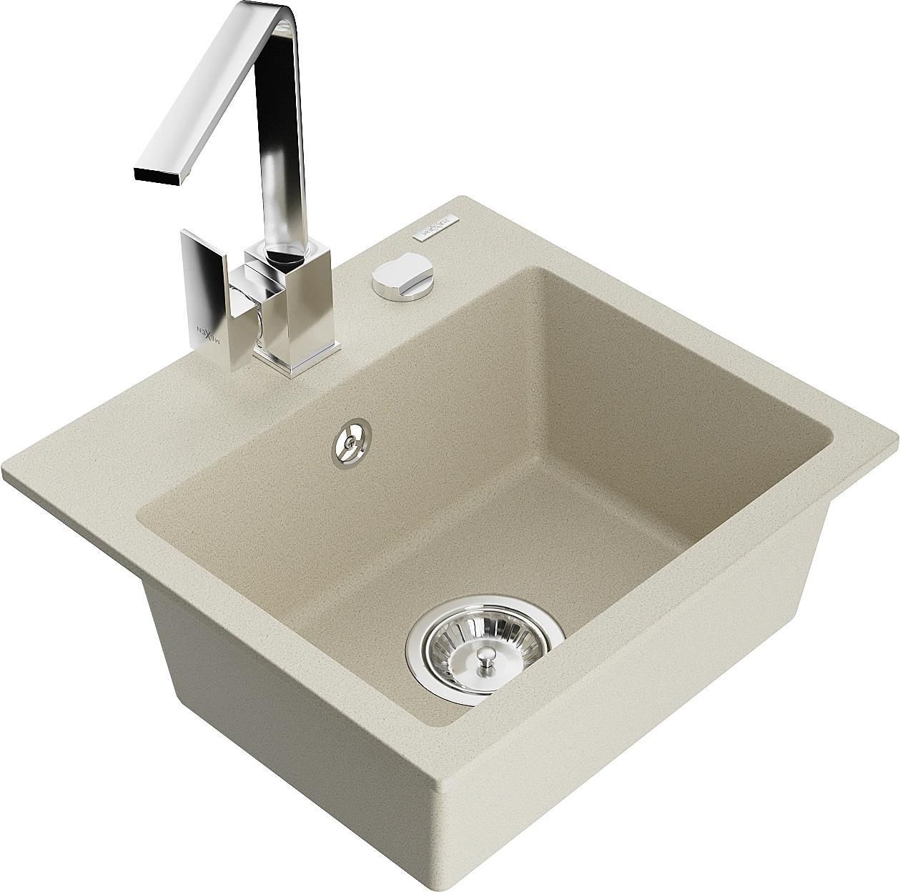 Mexen Milo zlewozmywak granitowy 1-komorowy z baterią kuchenną Rita, beżowy - 6505-69-670300-00 Dane produktu Producent: Mexen Nr katalogowy: 6505-69-670300-00 Kod EAN: 5905315018212 Cechy produktu Seria: Milo Dłuższy bok: 435 mm Krótszy bok: 410 mm Typ: Wpuszczany Kształt: Prostokątny Wyciągana wylewka: Nie Wysokość baterii: 29 cm Zasięg wylewki: 22 cm Możliwość podłączenia filtra wody: Nie Ilość komór: 1-komorowy Otwory: 2 Podcięcia pod otwory: 1 Ociekacz: Bez ociekacza Syfon automatyczny: Tak Przelew: Tak Kolor syfonu: Chrom Kolor zlewu: Beżowy Kolor baterii: Chrom Dane techniczne: Zlewozmywak: Rozmiar: 435x410x171 mm Głębokość komory: 161 mm Wymiary komory: 375x280 mm Średnica odpływu: ø90 mm Typ: 1-komorowy Rodzaj: Wpuszczany w blat Kolor: Beżowy Wykończenie syfonu: Chrom Materiał: Granit (80% kruszywo granitowe 20% żywice) Otwór przelewowy: Tak Otwory: ( bateria, automat ) 2 Wysoka odporność na zarysowania i przebarwienia Odporność na szok termiczny Powierzchnia ułatwiająca czyszczenie Jeden dodatkowy podfrezowany otwór do samodzielnego wybicia ø35 Bateria kuchenna: Materiał: Mosiądz Kolor: Chrom Głowica: Ceramiczna Perlator: Tak Typ: Jednouchwytowa Wysokość baterii: 290 mm Zasięg wylewki: 220 mm Jeśli dla Ciebie, tak samo jak i dla nas, wyposażenie łazienki i toalety ma być nie tylko funkcjonalne i ułatwiające życie, ale także ma stanowić ich ozdobę – koniecznie sprawdź naszą ofertę. Jeśli zgadzasz się ze stwierdzeniem, że elegancka funkcjonalność w połączeniu z nowoczesnym designem gwarantuje atrakcyjny wygląd łazienki oraz toalety na długie lata, to trafiłeś we właściwe miejsce. Witaj w świecie MEXEN!