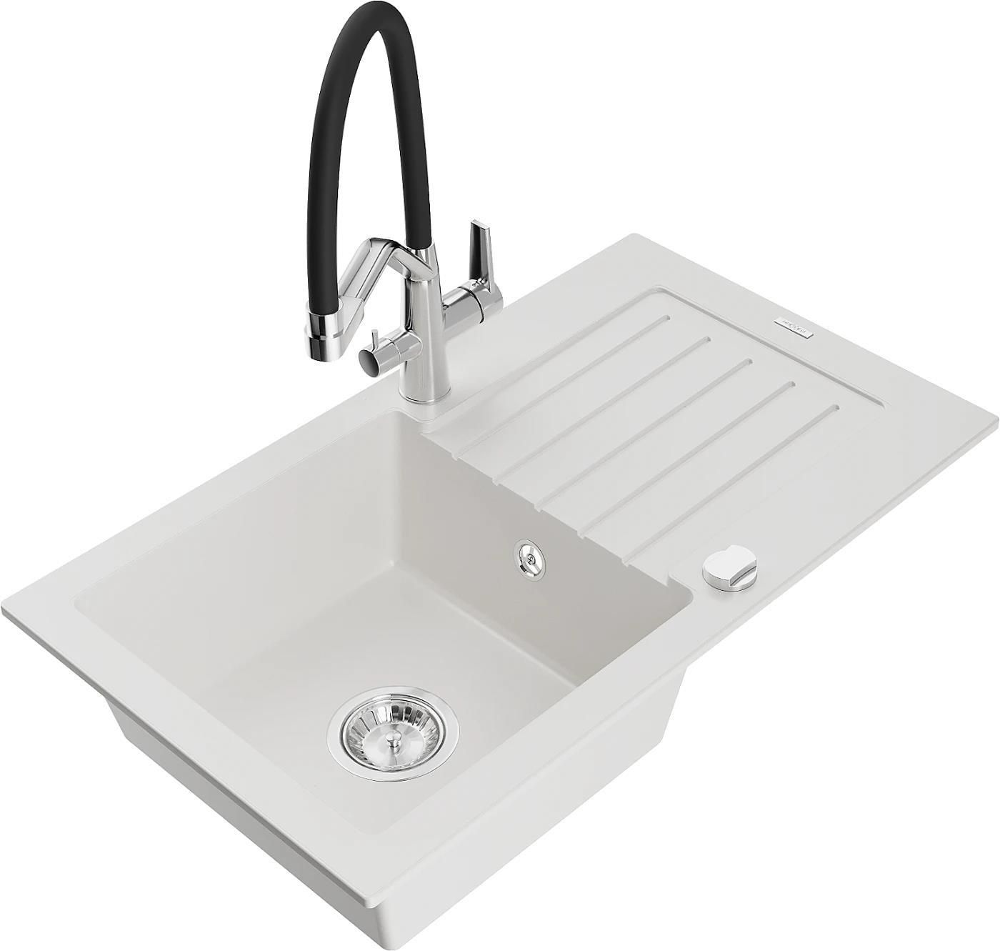 Mexen Pablo zlewozmywak granitowy 1-komorowy z ociekaczem i baterią kuchenną Duo, biały - 6510-20-671701-07 Dane produktu Producent: Mexen Nr katalogowy: 6510-20-671701-07 Kod EAN: 5905315100818 Cechy produktu Seria: Pablo Dłuższy bok: 752 mm Krótszy bok: 436 mm Typ: Wpuszczany Kształt: Prostokątny Wyciągana wylewka: Tak Wysokość baterii: 40,5 cm Zasięg wylewki: 26 cm Możliwość podłączenia filtra wody: Tak Ilość komór: 1-komorowy Otwory: 2 Podcięcia pod otwory: 2 Ociekacz: Długi ociekacz Syfon automatyczny: Tak Przelew: Tak Kolor syfonu: Chrom Kolor zlewu: Biały Kolor baterii: Czarny/Chrom Dane techniczne: Zlewozmywak: Rozmiar: 752x436x161 mm Głębokość komory: 151 mm Wymiary komory: 356x332 mm Średnica odpływu: ø90 mm Typ: 1-komorowy z ociekaczem Rodzaj: Wpuszczany w blat Kolor: Biały Wykończenie syfonu: Chrom Materiał: Granit (80% kruszywo granitowe 20% żywice) Otwór przelewowy: Tak Otwory: ( bateria, automat ) 2 Montaż: Uniwersalny, możliwość montażu z ociekaczem po lewej lub prawej stronie Wysoka odporność na zarysowania i przebarwienia Odporność na szok termiczny Powierzchnia ułatwiająca czyszczenie Dwa dodatkowe podfrezowane otwory do samodzielnego wybicia ø35 Bateria kuchenna: Materiał: Mosiądz Kolor: Chrom/Czarny Głowice: Ceramiczne Perlator: Tak Rodzaj wylewki: Elastyczna z mosiężną podpórką Zasięg wylewki: 260 mm Wysokość: 405 mm Typ: Dwuuchwytowa Bateria dwugłowicowa z dodatkowym kanałem do wody pitnej filtrowanej Jeśli dla Ciebie, tak samo jak i dla nas, wyposażenie łazienki i toalety ma być nie tylko funkcjonalne i ułatwiające życie, ale także ma stanowić ich ozdobę – koniecznie sprawdź naszą ofertę. Jeśli zgadzasz się ze stwierdzeniem, że elegancka funkcjonalność w połączeniu z nowoczesnym designem gwarantuje atrakcyjny wygląd łazienki oraz toalety na długie lata, to trafiłeś we właściwe miejsce. Witaj w świecie MEXEN!