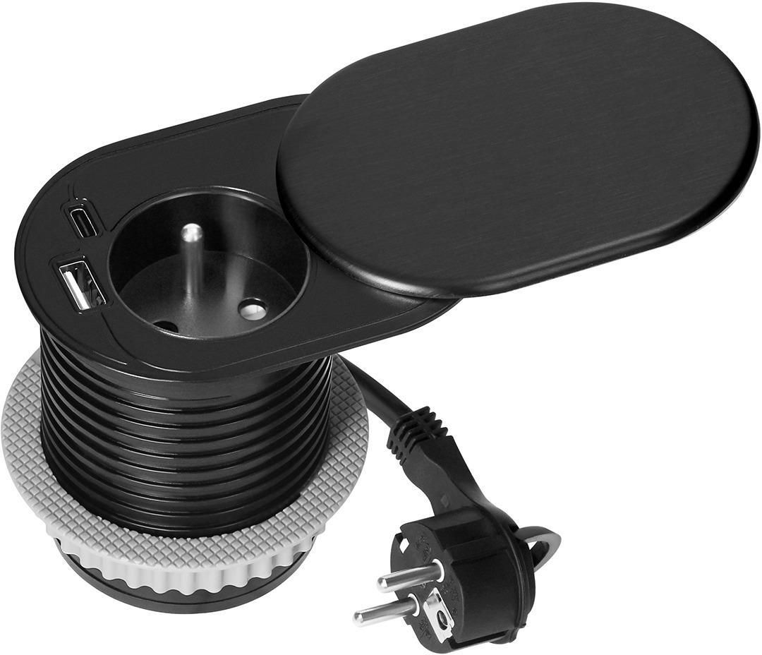 Gniazdo meblowe Ø6cm wpuszczane w blat z przesuwną pokrywką to nie tylko praktyczne rozwiązanie do podłączania urządzeń, ale także elegancki dodatek do każdego nowoczesnego wnętrza. Doskonale sprawdzi się zarówno w domu, jak i w miejscu pracy. Jedno gniazdo typu francuskiego (1x2P+Z) o max. obciążeniu 3680W oraz wbudowane dwa złącza ładowarek USB (typ A+C; 15W) umożliwiają podłączenie trzech urządzeń jednocześnie. Napięcie wyjściowe zasilacza USB wynosi 5V/3A. Przewód o długości 1,9 m zapewnia elastyczność w instalacji, a przekrój żyły H05VV-F3x1mm2 gwarantuje bezpieczne korzystanie z gniazda. Gniazdo wykonane jest z wysokiej jakości tworzywa sztucznego, dzięki czemu jest odporne na uszkodzenia, a aluminiowa klapka przesuwna chroni gniazdo przed dostaniem się kurzu. Gniazdo jest w kolorze czarnym, o owalnym kształcie. Gniazdo doskonale sprawdzi się wewnątrz pomieszczeń suchych, takich jak biuro, gabinet, sala konferencyjna czy salon. Dostępne również w wersji srebrnej. Informacje o produkcie: Model: Do wbudowania Model uchylny: nie Możliwość wysuwania: tak Napięcie znamionowe [V]: 230 Częstotliwość [Hz]: 50 Max. Obciążenie [W]: 3680 Standard gniazd: French (typ E) Liczba gniazd typu francuskiego (typ E): 1 Liczba złączy USB: 2 typ złączy USB: 1xUSB-A, 1x USB-C Z wbudowanym zasilaczem USB: tak Napięcie wyjściowe zasilacza USB: 5V/3,4A Stopień ochrony (IP): IP20 Model/kształt/forma: Inne Długość [mm]: 70 Szerokość [mm]: 100 Wysokość [mm]: 85 Średnica otworu montażowego [mm]: 64 Głębokość wbudowania [mm]: 80 Materiał: Tworzywo sztuczne + Aluminium Kolor: Czarny Długość przewodu zasilającego [m]: 1.9 Rodzaj przewodu: H05VV-F3x1,0mm2