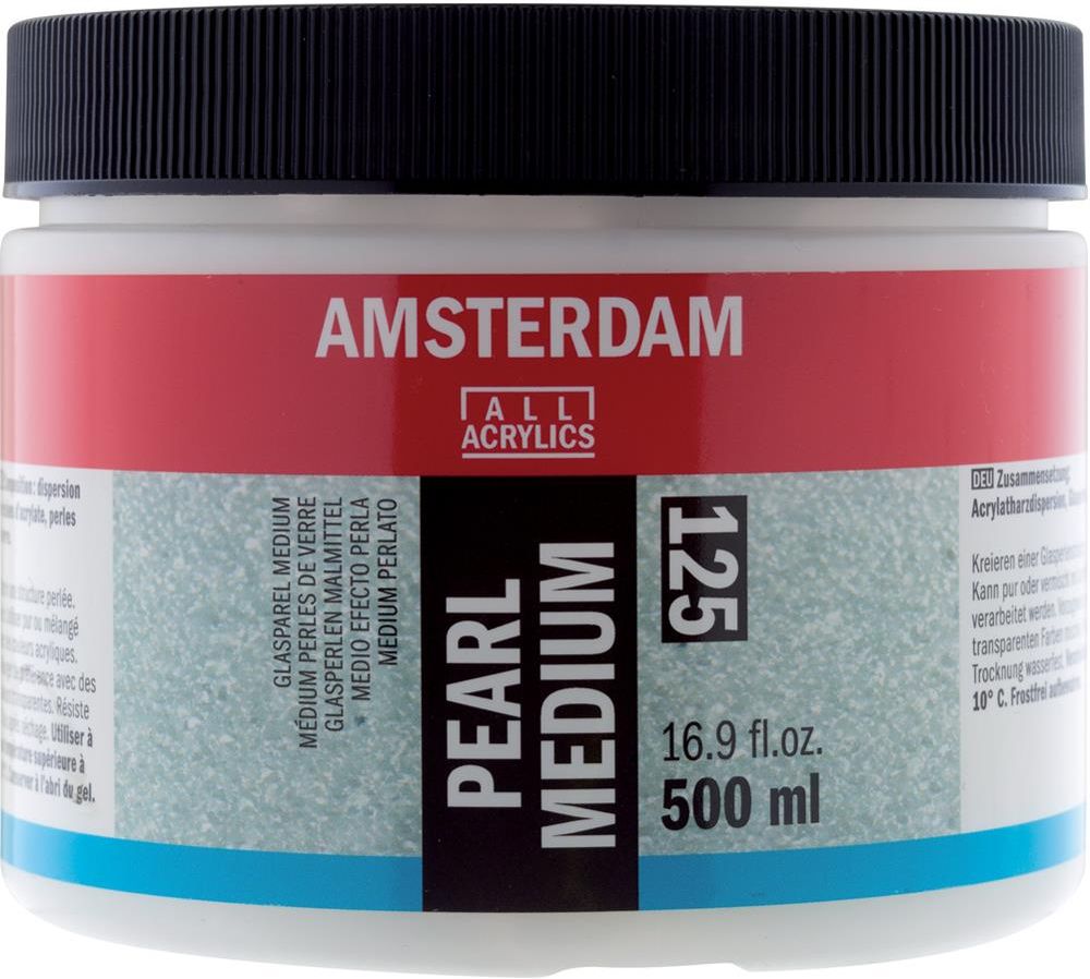 Medium perłujące Amsterdam Royal Talens 125 Pearl - 500 ml Żel 125 Pearl Medium od Amsterdamm Royal Talens umożliwia tworzenie unikalnych, przyciągających wzrok tekstur. Produkt składa się z maleńkich szklanych kuleczek zanurzonych w żywicznym spoiwie, który po wyschnięciu staje się zupełnie przezroczysty. Można mieszać je z farbą lub używać ich samodzielnie na wyschniętą powierzchnię, jako element w ciekawy sposób odbijający światło. Zaleca się stosowanie werniksu w sprayu lub nakładanie go w formie płynnej w jak najdelikatniejszy sposób, by nie doprowadzić do spienienia lub zmętnienia medium. Produkt może być nakładany na materiał lub powierzchnię odpowiednią dla farb akrylowych i mediów na bazie akrylu, tj. płótno, papier, drewno itp. Nadaje się również jako podkład pod farby akrylowe i olejne. Żel jest lekki nietoksyczny, odporny na wodę i nie żółknący.