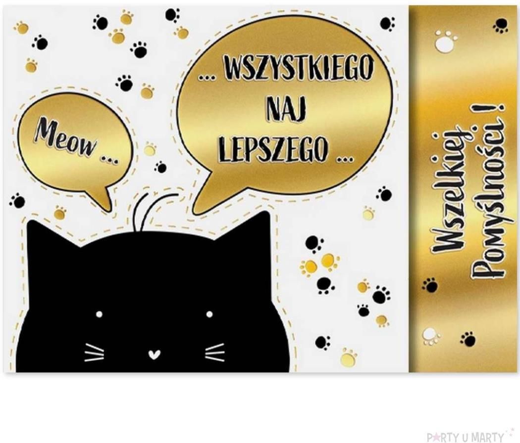 Kartka z kotem w złotym designie - zabawna i nowoczesna propozycja na wyjątkowe życzenia to kartka o świeżym, oryginalnym wyglądzie inspirowanym motywem kota. Na białym tle rozsypane są złote i czarne ślady łapek, a na środku widnieje sylwetka czarnego kota z wyraźnymi oczkami i pyszczkiem, który …