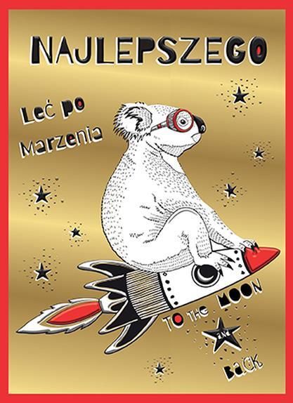 Wybierasz się na urodziny? A może zamierzasz złożyć komuś życzenia w formie listu? Śliczna kartka okolicznościowa zdecydowanie Ci się przyda! Na połyskującej złotej kartce widać sympatycznego misia koala na rakiecie kosmicznej, całą masę gwiazdek oraz napisy "Leć po marzenia" i "TO THE MOON AND …