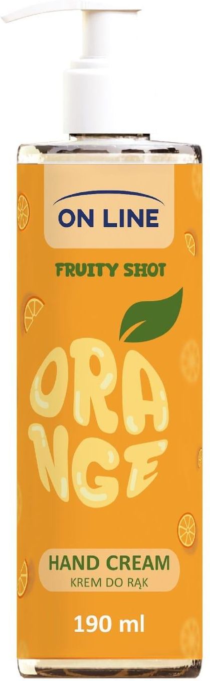 ON LINE Fruity Shot Krem do rąk Orange 190 ml FORTE SWEDEN SP. Z O.O. __________________________________________________________________ Krem do rąk On line Fruity Shot Pomarańcza bogaty w masło shea, roślinną glicerynę, a ekstrakt i olejek z pomarańczy zadba o Twoje dłonie , a zmysły otuli …