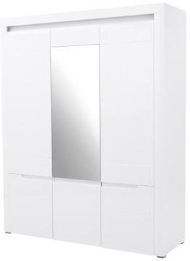 W szafie IRMA 3D możesz przechowywać odzież zarówno na wieszakach, jak i na półkach. Dzięki potrójnym drzwiom łatwiej jest korzystać z niej w wąskich przejściach. Możesz przeglądać się w lustrze znajdującym się na froncie szafy. Rozmiar lustra: 49 cm x 116,5 cm x 0,3 cm "System cichego domyku" sprawia, że drzwi szafy nie trzaskają. Możesz wyregulować wysokość nóg szafy, aby dostosować jej położenie do swoich preferencji. Szafę wyposażono w system oświetlenia LED, który podkreśla nowoczesny charakter mebla. Rozproszone światło sprawia, że w sypialni panuje przyjemny nastrój. WNĘTRZE Wnętrze szafy podzielono na 2 części. W szerszej części możesz przechowywać wyprasowaną odzież na 2 drążkach. Węższą część wyposażono w 4 półki, na których możesz trzymać poskładane ubrania. ARANŻACJA Połyskujące, białe fronty odbijają światło, wprowadzając do wnętrza odrobinę chłodnego szyku. To idealny mebel do sypialni urządzonej w stylu glamour lub nowojorskim. WYKOŃCZENIE Korpusy mebli pokryto laminatem, który łatwo jest utrzymać w czystości. Fronty szafy wykończono folią z połyskiem, dzięki czemu meble prezentują się elegancko i powiększają optycznie przestrzeń. Podchwyty prezentują się oryginalnie i nadają kolekcji nowoczesny wygląd. Montując meble, możesz zdecydować, czy chcesz skorzystać z dekorów w kolorze białym, czy w kolorze ciemnego drewna – dębu maggia.