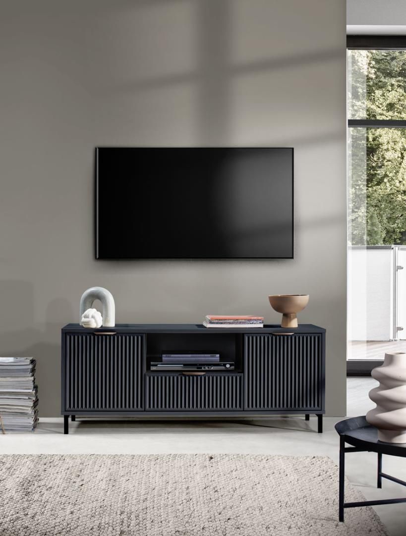 Podnieś Standard Swojego Domu z Kolekcją STYLES Potrzebujesz kolekcję, która łączy style we wnętrzu? Proste i funkcjonalne bryły które sprawdzą się w salonie, sypialni i jadalni? W takim razie kolekcja STYLES jest strzałem w dziesiatkę. Nowoczesne kolory, które są aktualnym hitem. Metalowe, czarne nogi dodające lekkości i przestrzeni w pomieszczeniach oraz wzór na frontach w postaci frezowanych ryfli to niewatpliwie atuty kolekcji STYLES. Zdecyduj się na zakup propozycji z kolekcji STYLES, a Twoje wnętrze zyska nowoczesny i elegancki wygląd. Natomiast praktyczne wnętrze i solidna konstrukcja kolekcji zapewnią Ci wygodę użytkowania przez długi czas. Nowoczesna szafka RTV, która świetnie nada się do mniejszych salonów to niewątpliwie S-3 z kolekcji STYLES. Intensywny kolor indigo, frezowane ryfle na frontach i metalowe nogi w kolorze czarnym dodają bryle niezwykłej elegancji. W środkowej części znajdziemy głęboką szufladę, w której możemy trzymać różne drobiazgi a nad nią półkę na dekoder czy konsole. Po bokach znajdują się dwie szafki na dodatkowe rzeczy. Nie czekaj dłużej! Odkryj naszą kolekcję mebli i przekonaj się, jak możesz odmienić swoje wnętrze w prosty i efektowny sposób. Kup nasze meble już dziś i ciesz się nowym poziomem komfortu i stylu w swoim domu! Wybarwienie Indigo Wymiary szerokość: 135 cm wysokość: 55,6 cm głębokość: 40,6 cm Materiał Korpus: wykonany z płyty laminowanej o grubości 18 mm Front: wykonany z płyty MDF o grubości 18 mm Informacje dodatkowe Frezowane ryfle na frontach dodające nowoczesności Obrzeże wzmocnione ABS Ciche domykanie frontów Ciche domykanie szuflad Osadzona na eleganckich metalowych nóżkach o wysokości 12 cm Metalowe uchwyty w kolorze miedzianym Szuflady na pełnym wysuwie Tył mebla wykonany z płyty HDF Kolekcja STYLES dostępna jest również w pięknej, jasnej tonacji CASHMERE. Sprawdź nasze pozostałe aukcje. Poniższe zdjęcia prezentują przykładową aranżacje