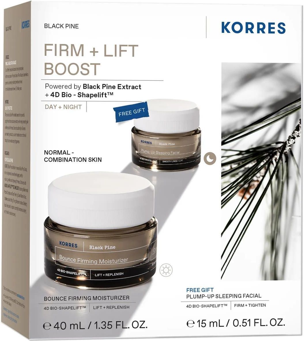 Korres Zestaw Black Pine Firm + Lift Boost (Krem na dzień, 40 ml + Krem na noc, 15 ml) Zestaw kosmetyków Korres do pielęgnacji twarzy zawiera krem na dzień oraz krem na noc. Korres Black Pine Krem na dzień, 40 ml Nietłusty krem ​​na dzień z technologią 4D Bio-ShapeLift™, który zapewnia …