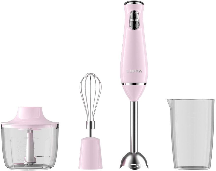 Wielofunkcyjny blender ręczny LOFRA MANO w stylu retro. Ma dwa poziomy prędkości, trzepaczkę, pojemnik do siekania i stalową końcówkę