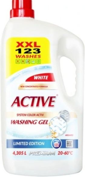 ACTIVE White – Żel do prania białych tkanin ACTIVE White to profesjonalny żel do prania, stworzony specjalnie z myślą o białych tkaninach. Doskonale sprawdza się zarówno w nowoczesnych pralkach automatycznych, jak i przy tradycyjnym praniu ręcznym. Dzięki swojej innowacyjnej formule łatwo rozpuszcza się w wodzie, skutecznie usuwając zabrudzenia i przywracając ubraniom nieskazitelną biel. Żel ACTIVE White nie tylko skutecznie pierze, ale także dba o tkaniny – nie niszczy ich struktury i włókien, dzięki czemu ubrania zachowują swoją miękkość, świeżość i elegancki wygląd przez długi czas. Delikatny, przyjemny zapach sprawia, że pranie staje się prawdziwą przyjemnością, a ubrania pachną czystością. Produkt jest idealny dla osób, które cenią sobie skuteczność, wygodę i bezpieczeństwo w codziennym praniu. ACTIVE White to gwarancja perfekcyjnie czystych, lśniąco białych ubrań i komfortu użytkowania w każdym domu.