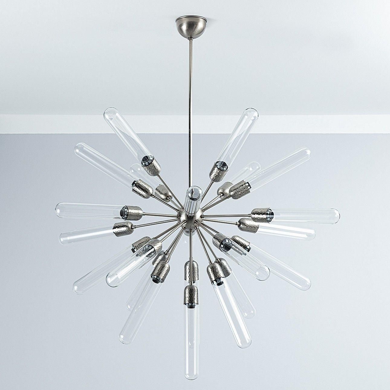 Lampa wisząca Dixon, ⌀106 cm Kod produktu: 005-558 Nowoczesna i przyciągająca wzrok lampa typu pająk, wykonana z metalu oraz szkła, o matowym wykończeniu. Doskonale zaprezentuje się w salonie oraz wysokim holu - miejscu, które najlepiej podkreśli jej walory dekoracyjne. Lampa dobrze prezentuje się z ozdobnymi żarówkami, które swoim kształtem dodatkowo podkreślają jej walory estetyczne i dekoracyjne. Przeznaczona na 22 żarówki (z gwintem E14, o max mocy 25W-nie ma w zestawie). Ciekawa propozycja dla miłośników oryginalnych elementów w aranżacji wnętrz. Wymiary: śr. 106cm, wys. 135cm. Dane produktu Waga: 12.00kg Rozmiar: ⌀106 cm Materiał: szkło, metal Kolor: srebrny