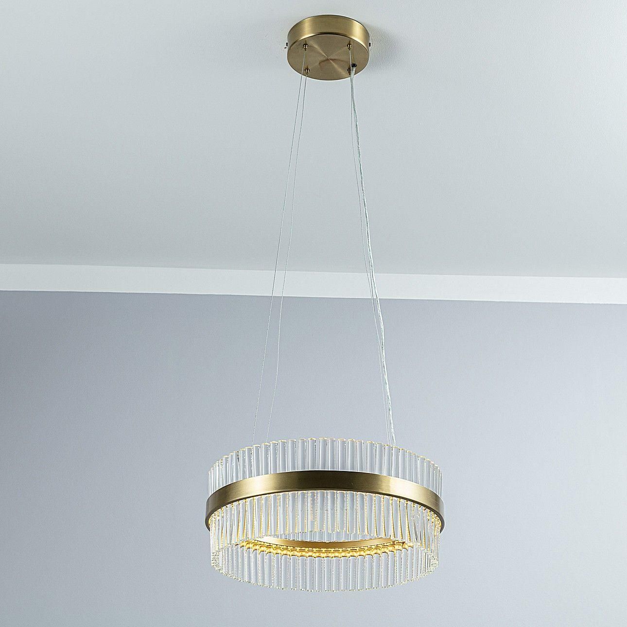 Lampa wisząca Imperior 50cm, ⌀50 cm Kod produktu: 005-554 Niezwykle elegancka i stylowa lampa wisząca wykonana z metalu oraz szkła. Metalowa obręcz w kolorze złotym o satynowym wykończeniu. Wewnątrz metalowej obręczy wbudowane jest oświetlenie led. Całość zamontowana jest na złotej (satynowej) podsufitce. Okrągły kształt lampy, połączenie złotego koloru i szklanych elementów zapewniają optymalne oświetlenie pomieszczenia. Doskonale podkreśli aranżacje utrzymane w stylu glamour, ale również te nowoczesne i klasyczne. Optycznie rozjaśni pomieszczenie dodając mu blasku i elegancji. Wymiary: śr. 50cm, wys. max. 132cm. Dane produktu Waga: 10.00kg Rozmiar: ⌀50 cm Materiał: szkło, metal