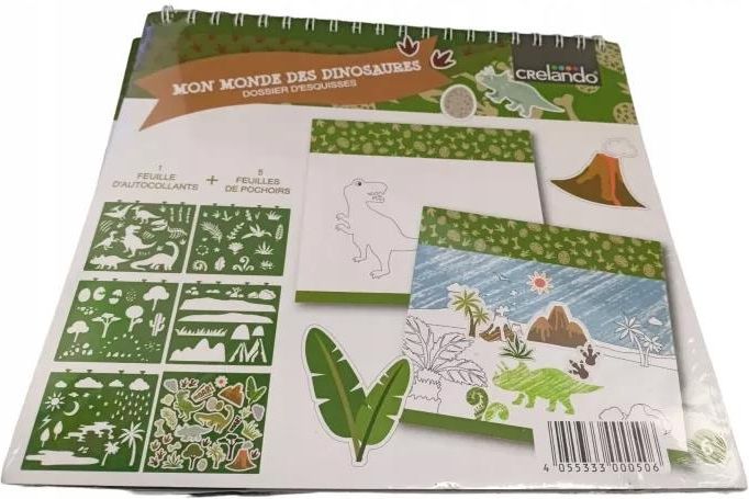 CRELANDO Kreatywna kolorowanka z szablonami DINOZAURY + naklejki CRELANDO Kolorowanka z szablonami DINOZAURY + naklejki Zaprojektuj swój magiczny świat Wszystkie elementy książki złączone spiralą Szkicownik zawiera wstępnie przygotowane tematycznie szkice, które możesz dowolnie kolorować, dodawać …