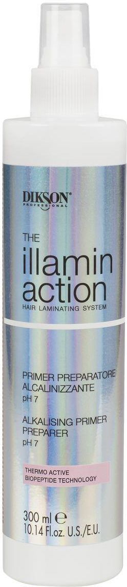 Dikson Illaminaction Primer 300 ml Alkalizujący Primer przygotowujący pH 7 300 mlOPIS PRODUKTU: PRIMER przygotowuje włosy do procesu alkalizacji protein, podczas którego włosy są nasycane odżywkami uzupełniającymi. Formuła o pH 7 pomaga otworzyć łuski bez uszkadzania struktury włosa. SPOSÓB UŻYCIA: po umyciu szamponem częściowo wysusz włosy, aby pozbyć się nadmiaru wody i równomiernie spryskaj Primer na całej długości wraz z końcówkami. Wmasuj i delikatnie przeczesz. Nadmiar produktu usuń suszarką do włosów, a następnie przystąp do Laminacji.