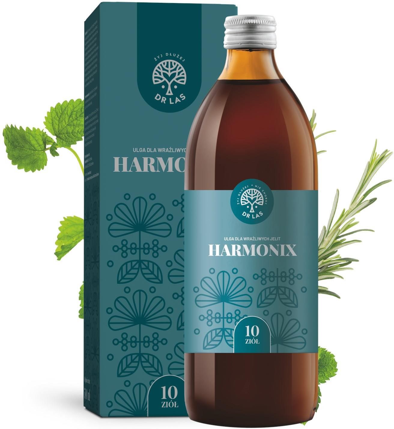 HARMONIX zioła na bezsenność, dobre trawienie i lepsze samopoczucie ZASTOSOWANIE Produkt bazuje na 10 specjalnie wyselekcjonowanych ziołach oraz dodatku soku z aronii – najbogatszego źródła polifenoli na świecie.  HARMONIX wesprze Twój organizm: w stanach napięcia nerwowego i stresu przy trudnościach z zasypianiem w uzyskaniu dobrego, relaksującego snu w normalizacji ciśnienia krwi przy dolegliwościach jelitowych przy wzdęciach i zaparciach przy nieżycie żołądka i niestrawności nerwowej ZALETY 1. W 100% naturalny preparat 2. Bez cukru, konserwantów i sztucznych barwników 3. Zawiera zioła o sprawdzonych właściwościach terapeutycznych.  4. Produkowany  w Polsce.