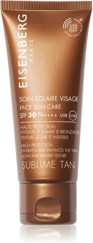 This UVA/UVB high protection facial sun care prevents photo-ageing and enhances your tan. Delicate and invisible texture on skin. Skin is intensely moisturised thanks to Aloe Vera and the Polysaccharide Complex, which slows down skin dehydration and strengthens the cutaneous barrier during sun exposure. Vitamin E completes the protective action against UV radiation damage. A tanning perfector with moisturising and antioxidant properties, with the sensual notes of the EISENBERG suncare range!